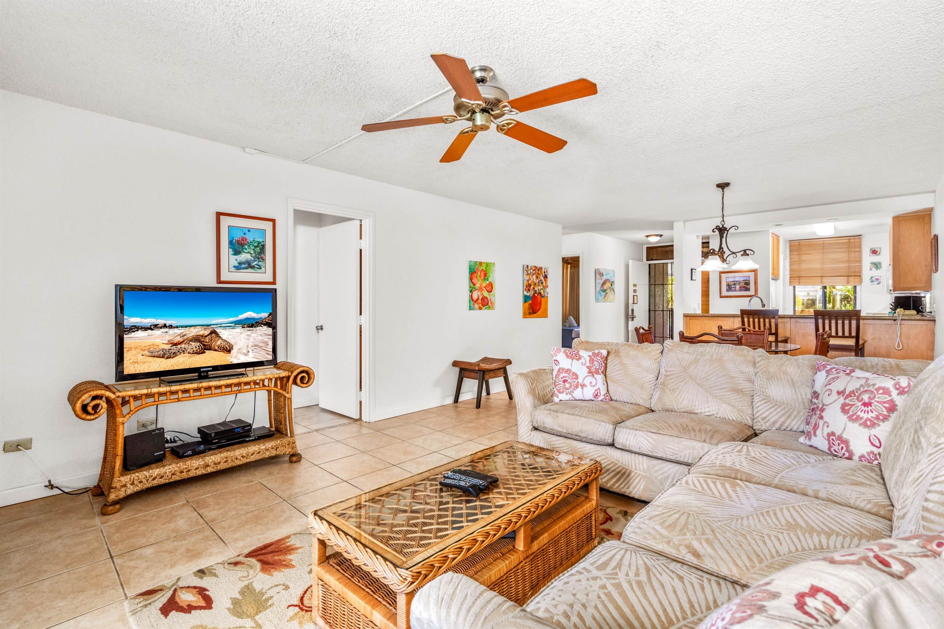 Kamaole Sands 5205 stands out as one of the most sought-after accommodations within the resort, boasting a two-bedroom, two-bathroom layout on the same level complete with the convenience of two parking stalls. This unit is a haven of tranquility, featuring a lanai that not only overlooks the verdant tropical garden but also offers glimpses of the ocean’s expanse. The interior of 5205 exudes a sense of openness and brightness, adorned with tasteful Hawaiian decor that enhances its airy/tropical ambiance. For those new to Kamaole Sands, the resort is a paradise for both guests and owners, offering a plethora of amenities such as a swimming pool, a dedicated kids’ pool, a relaxing hot tub, tennis courts, a well-equipped gym, and communal barbecue areas. Adding to the resort’s modern facilities are six newly installed charging stations for electric vehicles. Located just across the street is Kamaole Beach Park III, inviting you to indulge in the sun-soaked shores and azure waters. Moreover, a short journey from the resort will lead you to an array of exquisite restaurants and shopping destinations. To experience the allure of Kamaole Sands 5205, reach out to your preferred real estate agent and arrange a viewing.