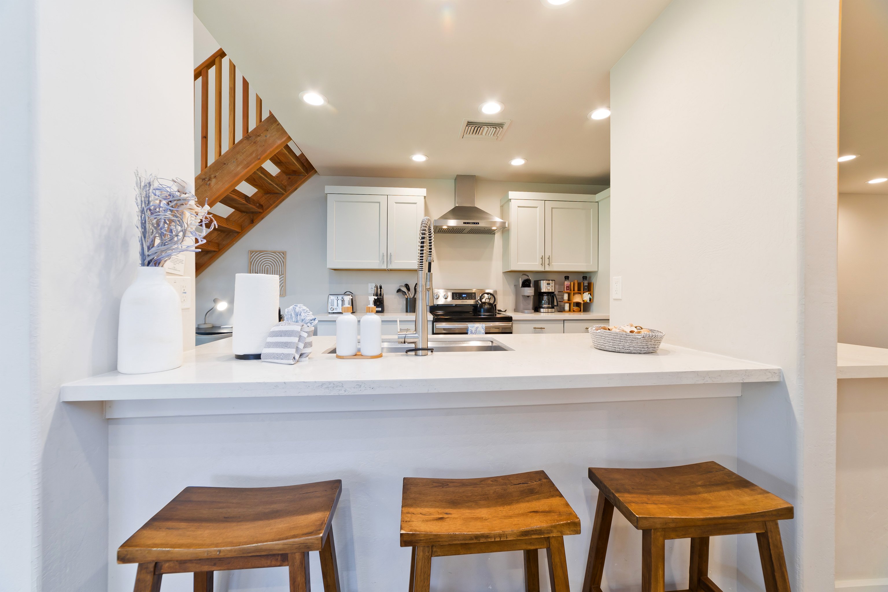 From the moment you step inside, you’re greeted by an airy, open concept living space that flows seamlessly to your private lanai. Natural light spills in, highlighting the thoughtful upgrades and refined design choices throughout. The kitchen features quartz countertops, sleek cabinetry, and a full suite of newer appliances, ideal for preparing fresh island meals.