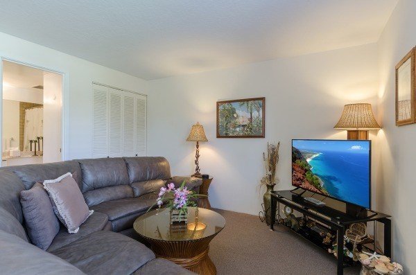 Fully furnished one bedroom, two full bath single-story, end unit condo with lanai overlooking the pool. This condo is ready to go and oh so clean. The current and past owners have made this condo their home and the pride of ownership really shows. Super clean and functional for personal use, vacation rental, or both! Beautiful views off the lanai of the pool area and lagoon with fountain. The extra bathroom is a huge bonus. Improvements include: - New Queen Bed & Box Springs - New Microwave Hood - New A/C unit in Bedroom - New 48" TV in Living Room - New 48" Wall-mounted Television in Bedroom - New Dining furniture - New Bar Stools - New Lanai Chairs - Completely Repainted Interior If you are looking for a turnkey investment that can be vacation rented for under $300,000, this is it! Monthly fee includes water, parking, internet, cable, sewer and all exterior insurance (fire, flood, hurricane). All of this and just a few steps to the beach.