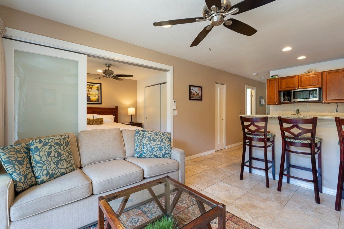 At a Glance: Fully furnished and turn-key. Tile flooring and granite countertops. Storage on the lanai. Pantry. Ice maker. In-room washer and drier. Hot water is part of the maintenance fee. Deeded parking space. Two pools and BBQ areas. Community recreation room.
