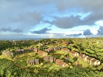 Nihilani at Princeville Resort – Built in 2005. 102 2 & 3 BR, 1 & 2-story units in 34 2-story buildings. Every residence has an attached 2-car garage. The homes on one side of the community line the fairway of Makai Golf Course. Amenities include pool, spa, pavilion, BBQs.