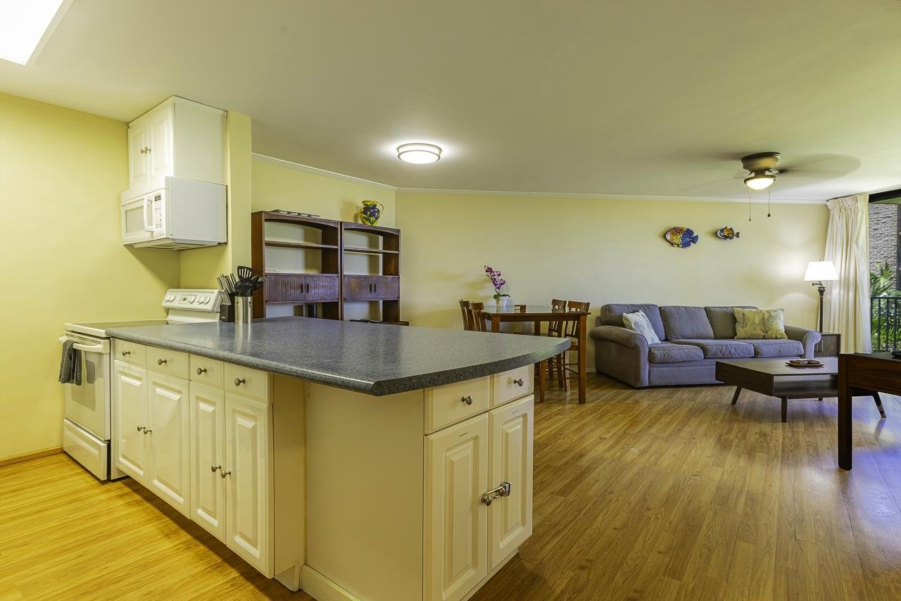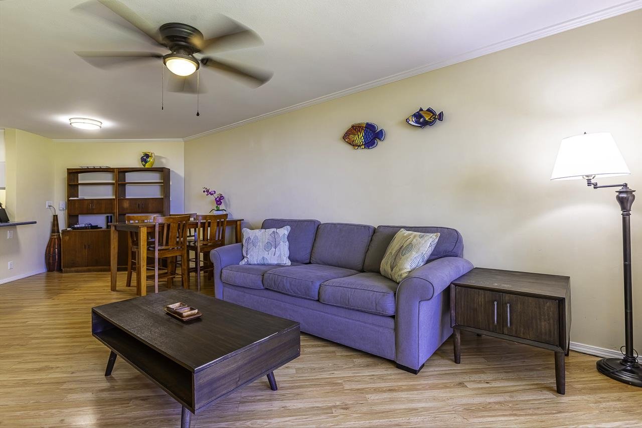 Kauhale Makai 203 is a beautifully appointed one-bedroom one bath unit with ocean views. The unit features wood laminate flooring, crown molding, smooth ceilings and an upgraded bath with stone tile showing enclosure. The complex features a beautiful pool area with bbq's for grilling. Located in central Kihei, it is close to dining and shopping. It is a great place to drop your bags and explore what Maui has to offer. The unit has been in a successful vacation rental management program. Offered turnkey furnished. Make a plan to see it today!