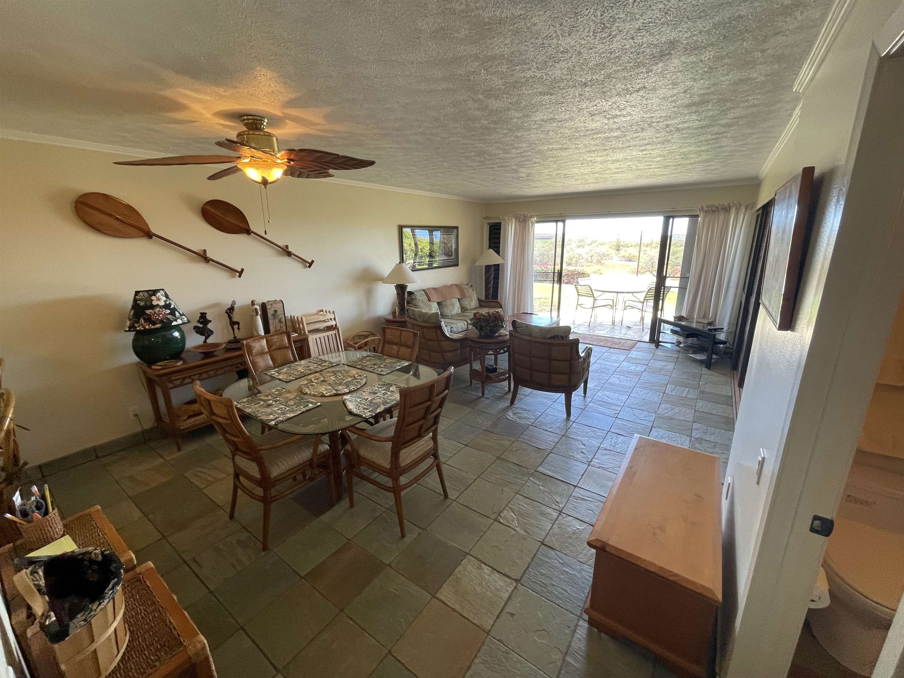Remodeled 2 bedroom, 2 bath ocean view furnished unit. Ground floor unit has been updated with Italian slate flooring, laminate flooring in both bedrooms, newly tiled bathrooms, 2 outdoor storage units, custom made curtains to keep the unit cool, kitchen wares, linens & bedding, golf clubs, new Samsung side-by-side refrigerator, Dish washer, washer/dryer. There are BBQ grills & picnic tables, 2 tennis courts, sparkling blue swimming pool & hot tub, cabana area, on-site resident manager and front desk. It is a short walk to nearby Kepuhi and Make Horse beaches or you could walk to Papohaku Beach. Surfing, hiking, biking, snorkeling, fishing or enjoy a wonderful day lounging on the beach. Enjoy Molokai's amazing sunsets. Ke Nani Kai is a 20 minute drive to the airport and town for groceries. There is a convenience store located in the Kaluakoi Resort.