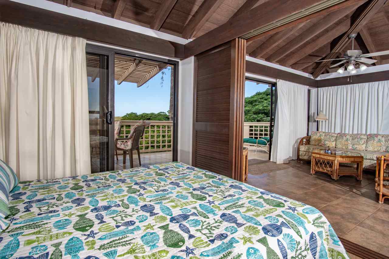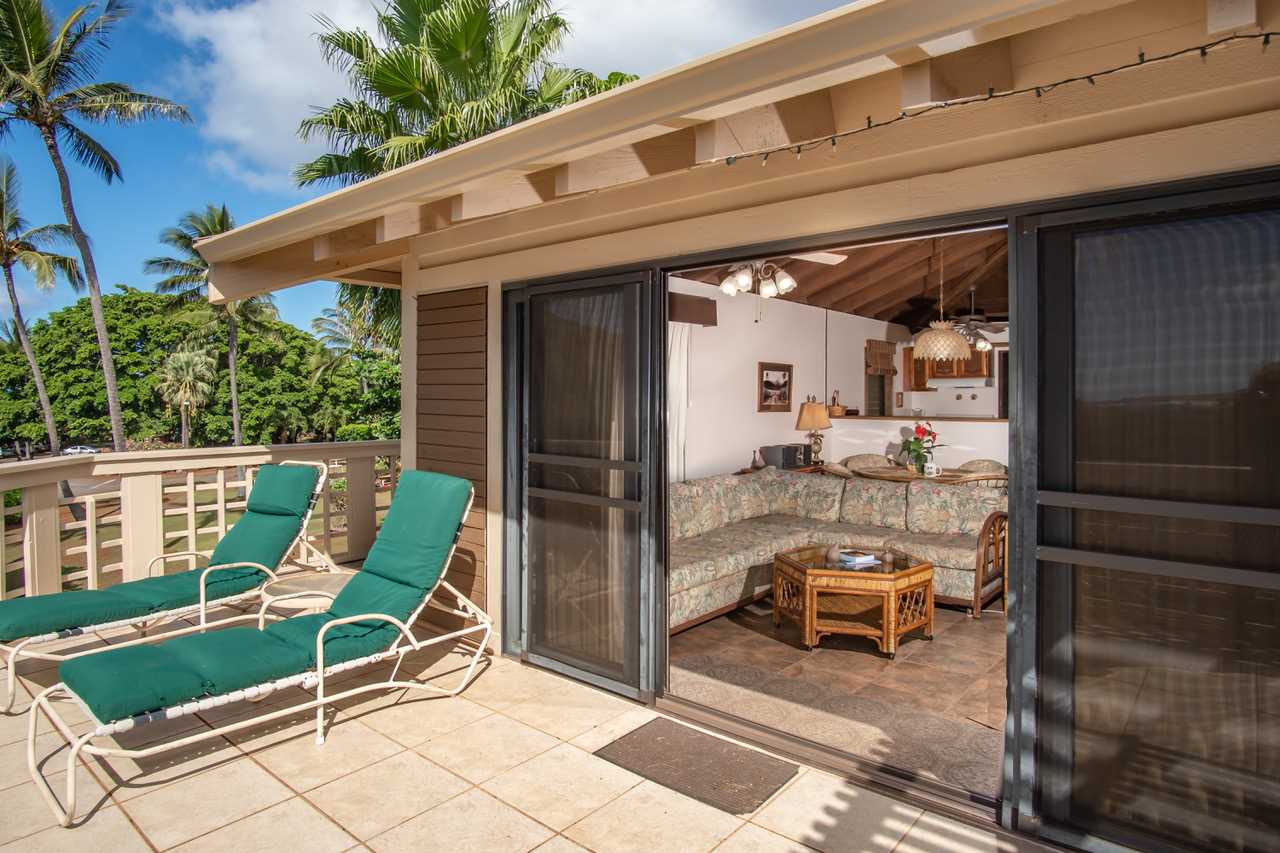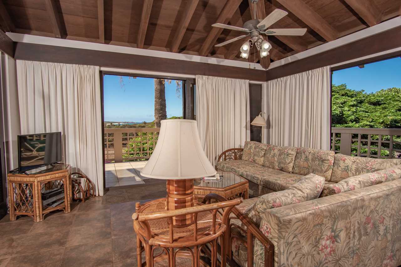 This second floor end unit offers stunning ocean and garden views and a wrap-around lanai. The bedroom and living room overlook Papohaku, the longest white sand beach in Hawaii, and its amazing sunsets. The living room and side lanai overlook a garden that extends to the resort amenities: pool, spa, BBQs, tennis courts, library and outdoor dining pavilion maintained by the HOA. Adjacent condos are set back so they do not view into this unit. Screening from mature landscape adds to the condo's privacy. Windows on three sides of the condo enable excellent cross ventilation from trade winds, enhanced by fragrance from the plum aria tree at the condo entry and the date palm off the front lanai. At night, the lanai offers stellar views of constellations rolling across the sky. An open-beam ceiling and three ceiling fans add to the condo's airy and spacious feeling. Kepuhi Beach, a favorite with local swimmers and surfers, is a short walk away. Although short term rentals are allowed at Ke Nani Kai, this condo is not used as a vacation rental.
