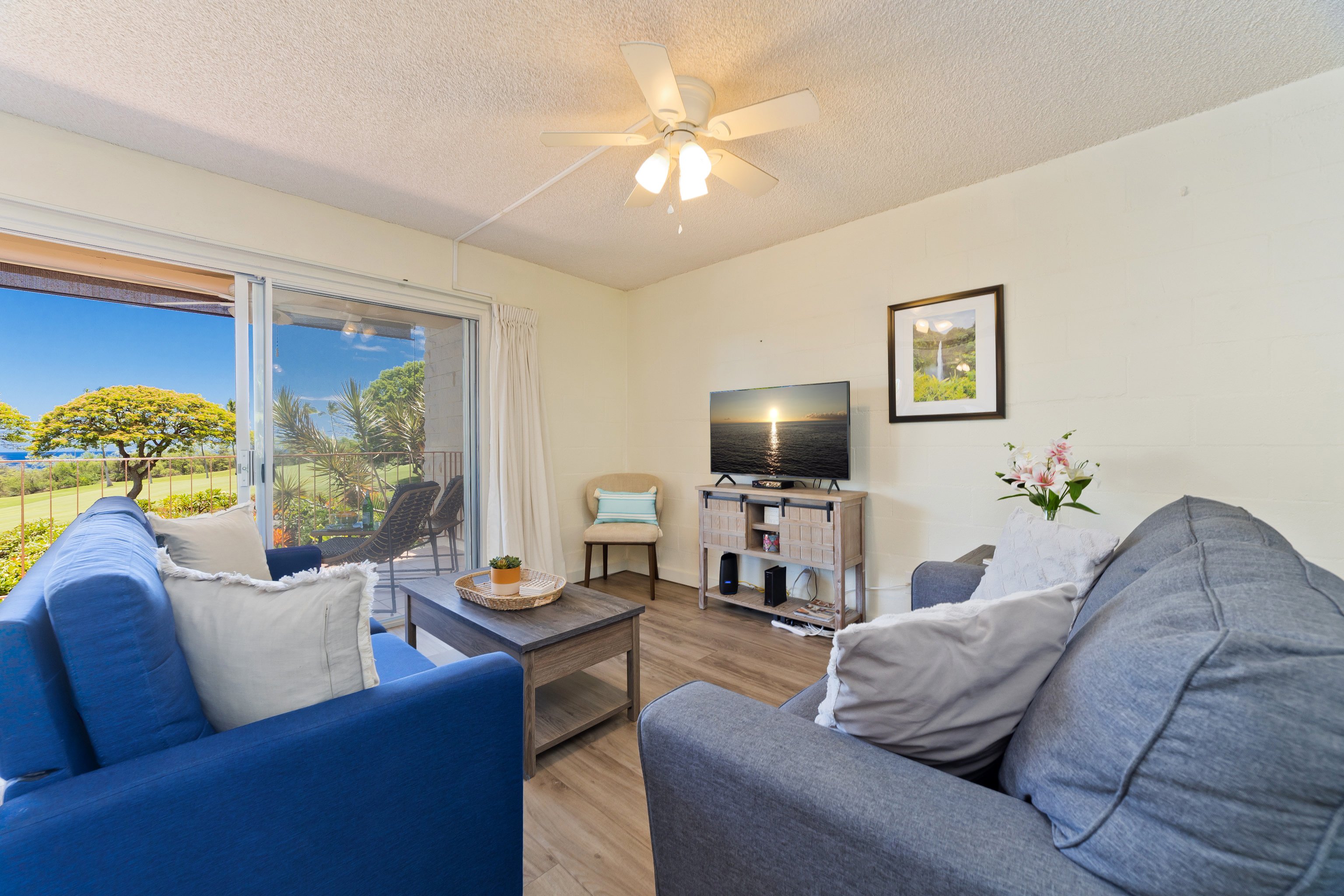 As you enter, be captivated by the floor-to-ceiling louvered windows that invite the gentle ocean breezes and showcase the panoramic ocean, garden, and 9th fairway views from every room. The main living area, both bedrooms and the private lanai offer a mesmerizing backdrop that truly embraces the beauty of the Hawaiian landscape.