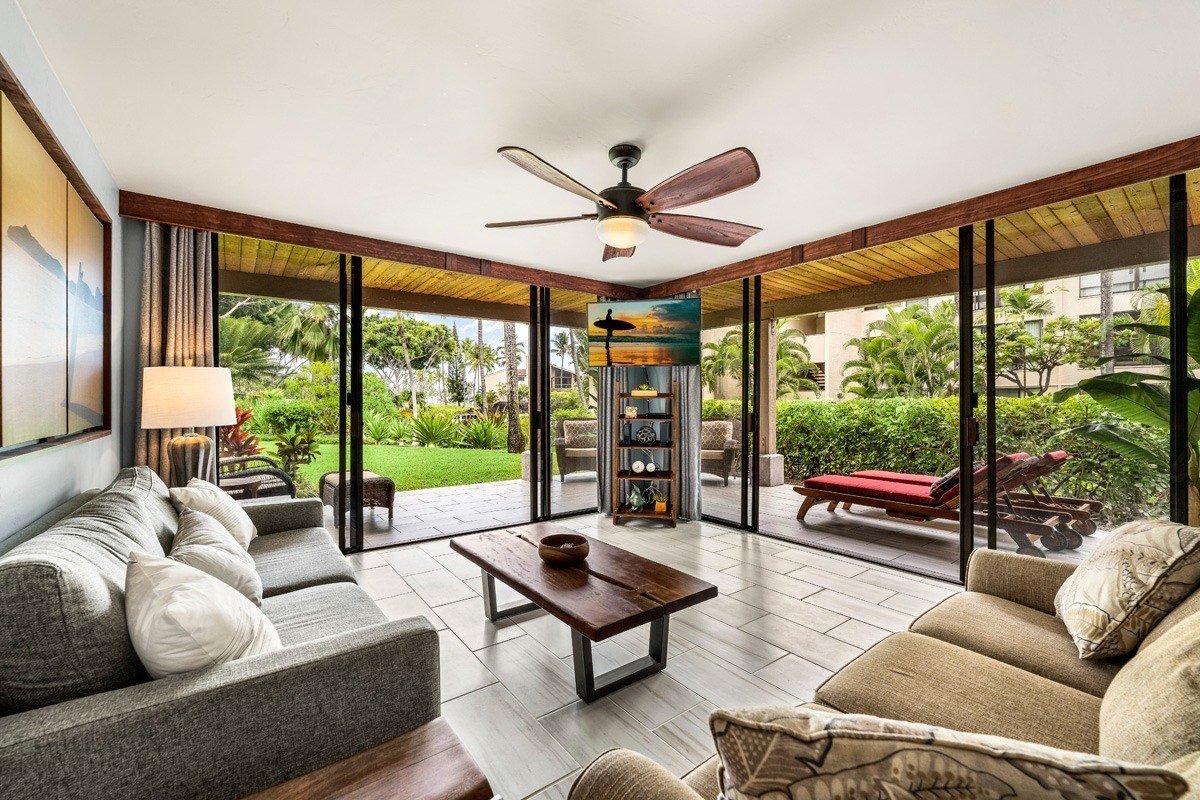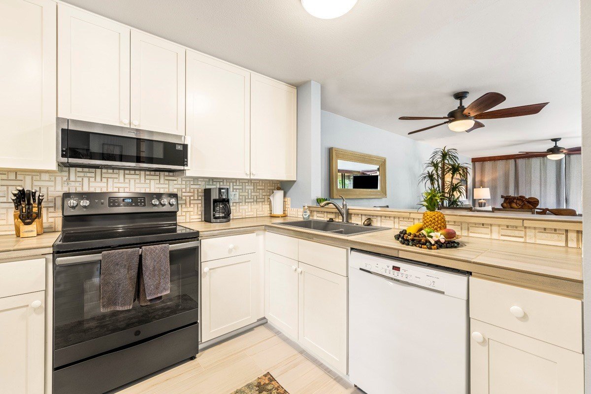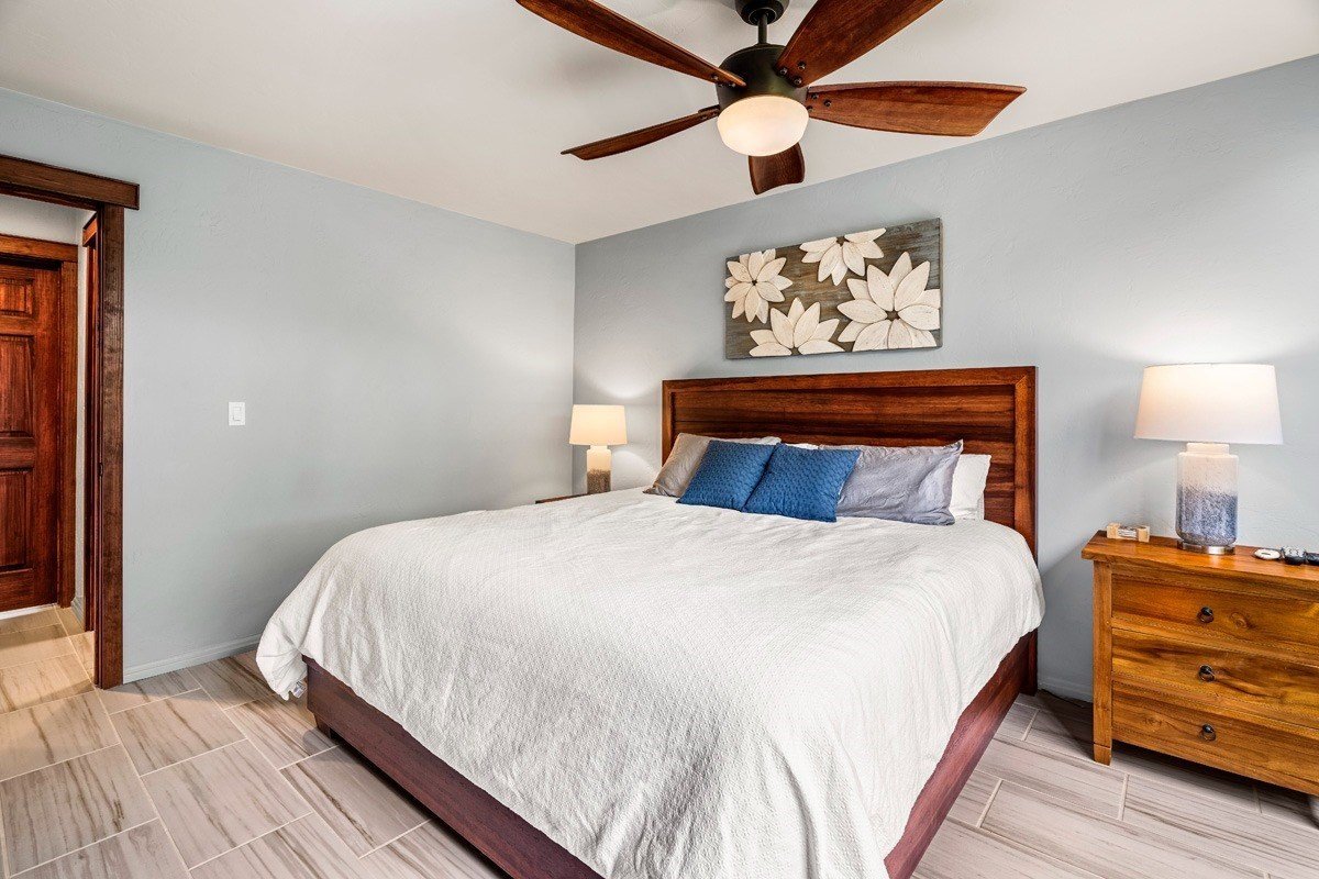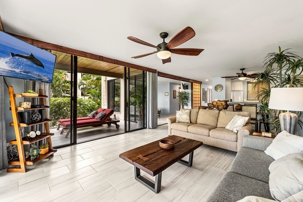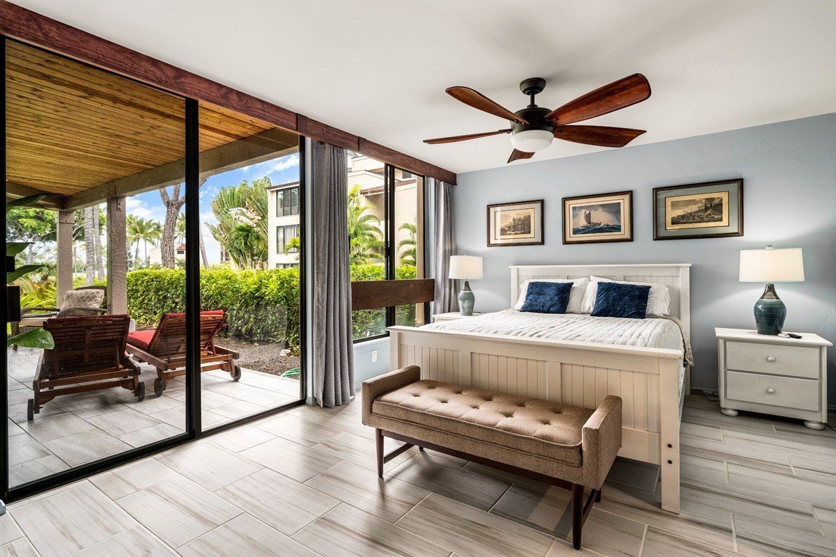 Truly incredible, rarely available corner unit available at the Popular Keauhou Kona Surf & Racquet Club. This spectacular STVR registered property has been remodeled from top to bottom. The attention to detail is one of a kind! A Beautiful Contemporary design with highly unique & special finishes throughout the space. Notable Features to include: ~Absolute Brand New Gorgeous Slate Tile Installed throughout the interior & carries out to the extra spacious wrap-around Lanai. ~Custom Shoji Door Wood Inserts to allow durability & strength: Excellent feature for the Rental Element! ~Stunning solid wood doors throughout the condo, including the bi-folds for the closets! All doors & door trim are hand-stained with an oil-rubbed finish. All hardware on the doors and in the bathrooms is top-quality oil-rubbed bronze. ~Beautiful Chef's Kitchen: Amazing tile countertops and backsplash, Wonderful New Appliances ~THE VIEWS: Enjoy a partial ocean view or a wide open view of the golf course! It’s a highly desirable end corner unit on the ocean end of building #6. ~The Bathrooms are so perfect. You'll appreciate new vanity cabinets, new tile in showers, new countertops & shower doors.