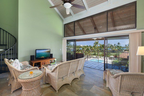 Imagine yourself sitting on your west (sunset) facing lanai with a partial peek-a-view of the ocean, enjoying the feeling of living in a tropical paradise, surrounded by coconut palms, blooming plumeria trees, bright crimson bogenvillias, and lush Hawaiian vegetation, with "big-sky" views all the way to the ocean. Play golf next door or go down to the beach for personal or watercraft ocean sports.** Top floor, 3 bedrooms, 3 baths ** A spiral staircase leads to loft (3rd. bedroom) ** Large covered lanai (200 sq. ft.) overlooking the pool and luscious surroundings ** Tastefully remodeled kitchen with granite counter tops, tiled flooring, and cabinets with "soft close" drawers ** Attractively remodeled master and guest bathrooms with granite counter tops, tiled flooring. ** High vaulted ceilings in the living/dining area, master bedroom, and guest bedroom ** Ceiling fans in kitchen, living/dining area, all bedrooms and lanai ** BBQing is permitted on your lanai ** Vacation rentals are allowed, 5 day minimum, offering you extra income potential ** Turnkey furnishedKeauhou Punahele includes a beautiful pool/spa in a tropical setting for your enjoyment.Conveniently located: Close to the Sheraton Hotel, Keauhou Shopping Center (shopping, dining, movies), above Keauhou Bay (outrigger canoe paddling, stand-up paddling, kayaking), 1 mile from Kahalu’u Beach Park (swimming, snorkeling, surfing), and unlimited outdoor adventures all over the island - and all within an easy drive.Monthly Maintenance fee includes: Resident manager, basic cable, water, trash collection, monthly pest control, common area landscaping, master policy insurance on the project, and exterior care and maintenance of buildings. 1 small pet is allowed (with board approval). 1 assigned parking space (#77).
