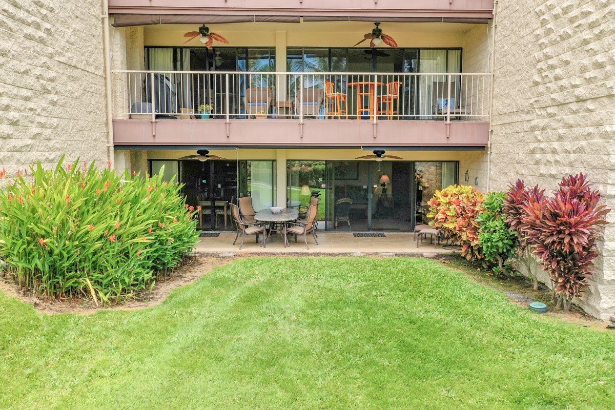 Beautifully decorated and appointed move in ready ground floor 2 bedroom 2 bath unit. Upgraded tiled floors throughout and beautiful kitchen with updated wood cabinetry. Each bedroom has a king bed and the living room couch pulls out into another bed to accommodate 6 sleeping. This was a private family 2nd home and partial vacation rental ready for a new family to enjoy. Borders the golf course so you have nice views. Close to Keauhou Bay for all your favorite water sports. Turnkey ready to move in. The E building is at the end of the complex so it's very quiet and serene. This unit is situated and set back so you aren't looking at anyone else while you are outside on your lanai for ultimate privacy. You can also have a pet with board approval.Must see.