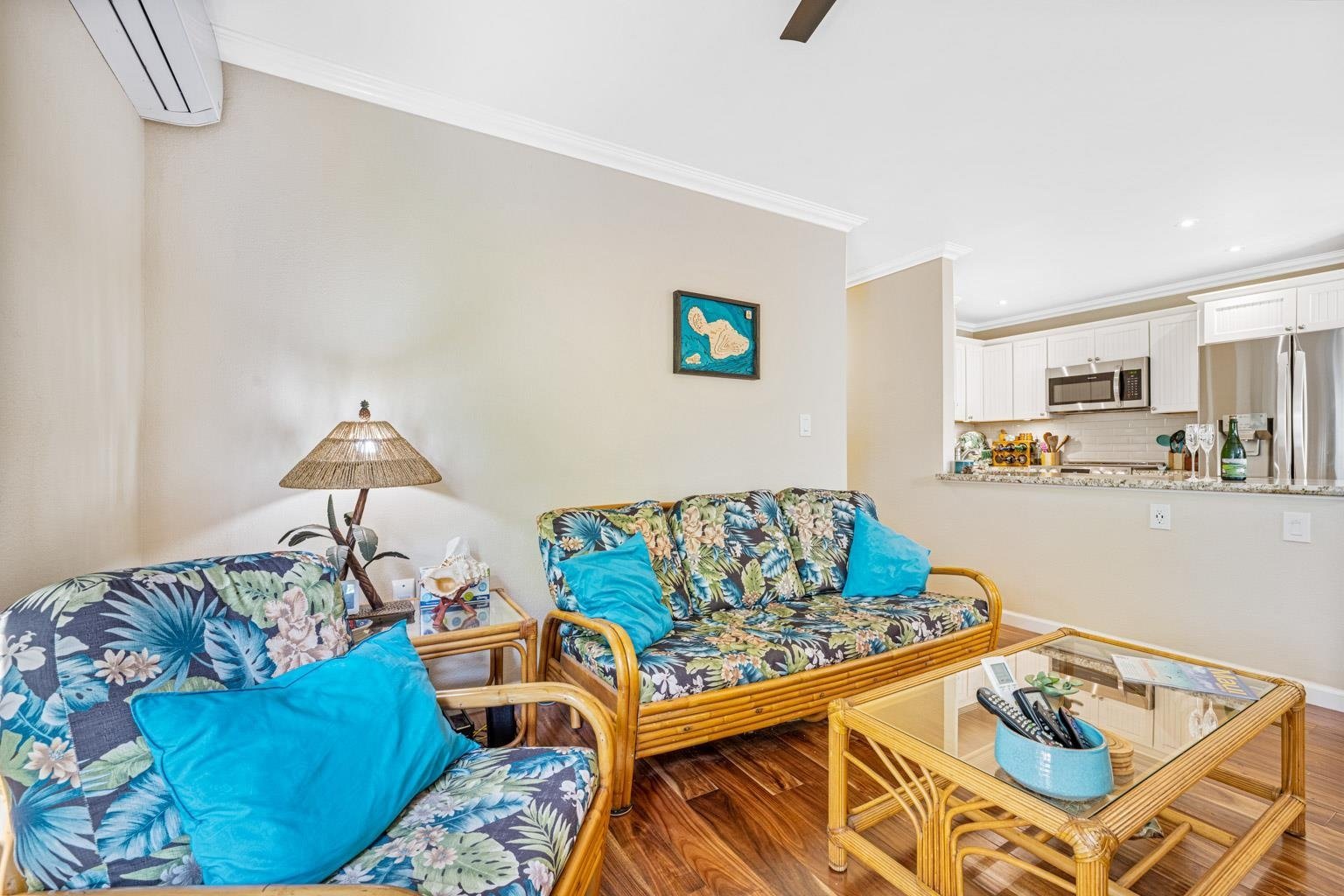 Too many upgrades to list! This completely renovated modern ground floor unit is located in the highly desirable peaceful far corner of the complex. Unit 3-102 boasts everything from crown molding throughout, double paned windows, new screens, wood floors, split AC in the master, second bedroom and living room, full size stacking LG washer and dryer, gorgeous walk-in shower, modern barn door slider door between walk in closet and bathroom, all new vanities and sinks, travertine tile, redesigned kitchen to a U shape creates a longer counter space along with all stainless appliances. Outside you will find a dedicated bbq space on the lanai, two large locking storage sheds, multiple mature trees which give the lanai a private and lush atmosphere and meticulously placed pavers which expand the lanai space. Be sure to have your Realtor send you the complete renovation list! Tandem parking allows for two cars and this unit is located near multiple guest parking spots yet is set back from the parking lot so you can enjoy the quietness. Keonekai Villages is dog friendly and pet owners can easily access the dog park which is at the entrance of the association. A short walk takes you to the beach, shops and restaurants. Extremely simple access to the highway coupled with the close proximity to the beaches makes this association the perfect home for you!