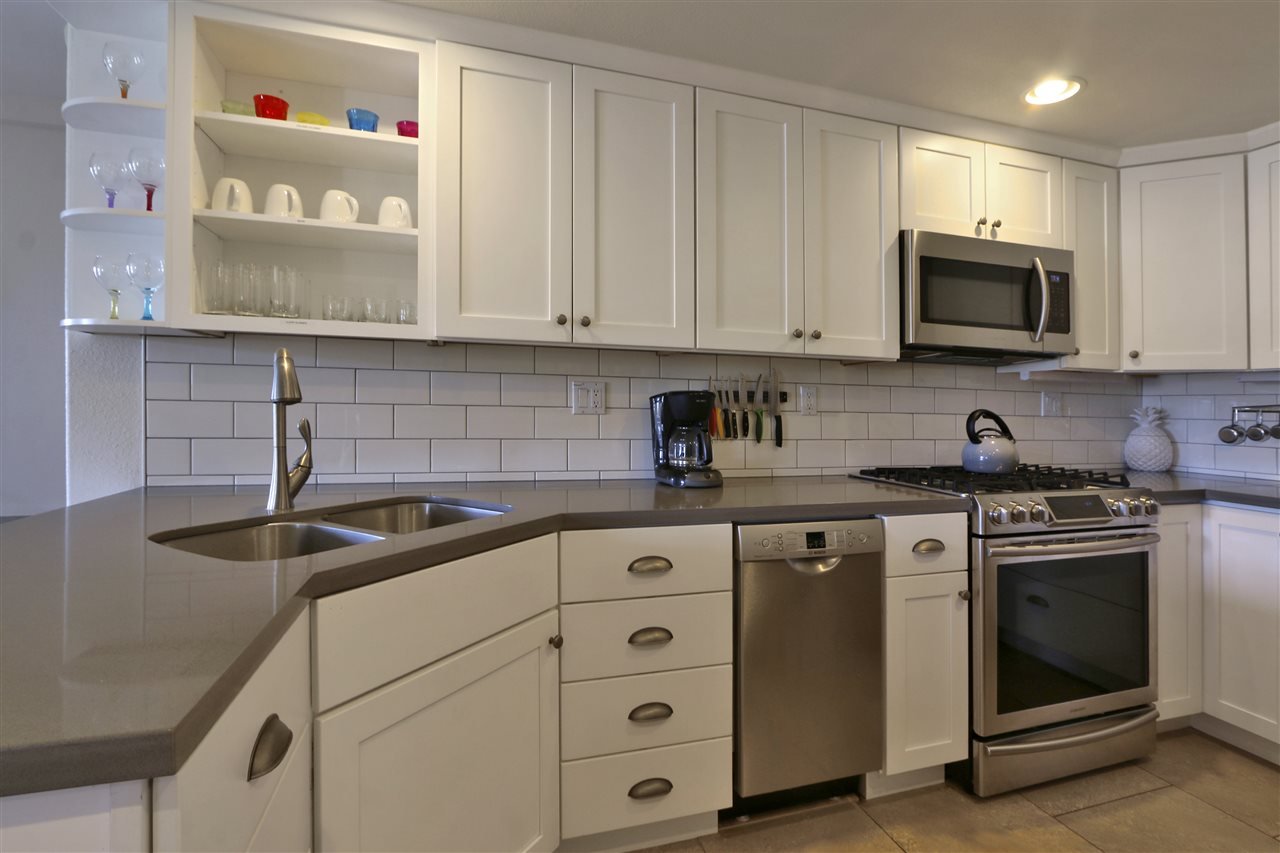 You'll be impressed with the beautiful remodel in this ocean view unit at Kihei Akahi, just a stone's throw from Kamaole Beach Park II. Equally impressive are the quartz countertops, white shaker cabinets, gas range, stainless appliances, three new split AC units (very quiet), full size washer/dryer, and tile floors in the kitchen, living room, and both baths. From your lanai and both bedrooms enjoy views of the sparkling Pacific, stunning sunsets year round, watch for whales from December thru May, and let the lapping waves lull you to sleep at night. Kihei Akahi is one of the most meticulously maintained complexes in South Kihei, located on an easy stroll to plentiful shopping, restaurants, coffee shops, and virtually every convenience. Plus a bus stop in front of the complex, so your guests don't really even need a car.