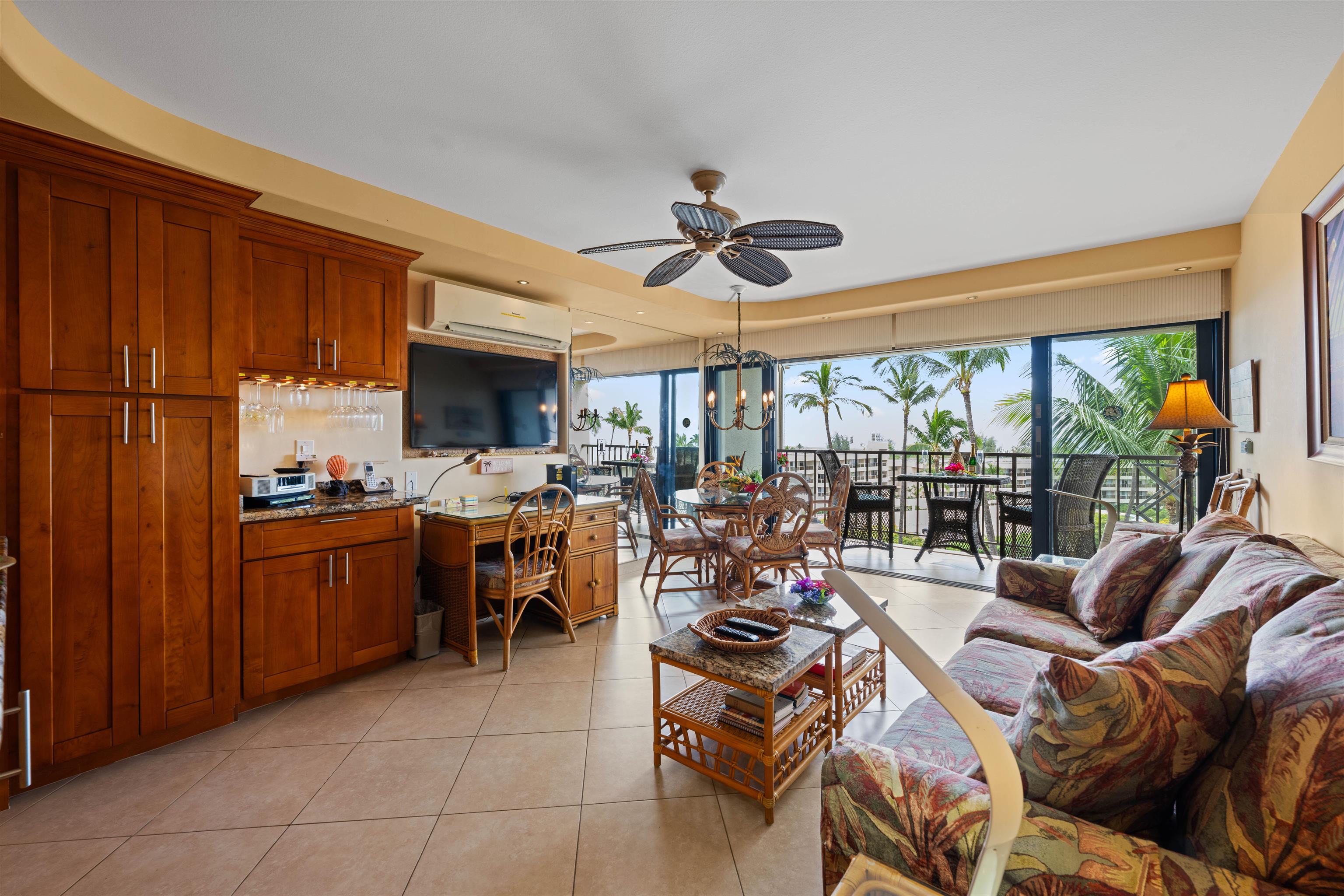 This remarkably upgraded and very successful 1-bedroom vacation condominium is located direct center on the fifth floor of the D building. This is one of the best 180+ degree ocean and year-round sunset views in all of Kihei Akahi. Unit D510 is exceptional and luxurious, reflecting a transformation that began in 2013 with a thorough and upscale renovation. Key upgrades include: Luxurious Tile Flooring: Adds a sophisticated touch to the entire unit, enhancing its elegance. Open Plan Layout: The removal of a wall separating the kitchen and living room has created a spacious, open atmosphere. This design choice is popular for its ability to facilitate social interaction and a sense of openness. Split AC System: Ensures comfortable living conditions, providing efficient temperature control. Custom Cherry Wood Cabinetry: The integration of these cabinets throughout the unit adds to the aesthetic charm and enhances its elegance. Custom Rounded Soffit Ceilings: Present in the living room and above the kitchen, these ceilings contribute to a unique architectural element, enriching the aesthetic appeal. Gourmet Kitchen with Granite Countertops: The kitchen is a highlight, featuring a thoughtful 'make sense' design. The full granite backsplash complements the slab granite countertops, and the double sink enhances functionality. High-Quality Appliances: The mention of a stainless steel Fisher & Paykel refrigerator indicates the use of premium appliances, adding to the kitchen's appeal. Custom Lazy Susans: These provide practical storage solutions, maximizing space efficiency in the kitchen. As you step onto your private lanai, a mesmerizing 180 degree ocean view unfolds before you - an expanse of azure ocean, along with year-round sunsets blazing across the sky, and the prestigious three-island panorama of Kahoolawe, Molokini, and Lanai. It's a visual symphony that captures the essence of island beauty. This home, offered fully furnished and turnkey, represents an unparalleled opportunity. Ideal for those aspiring to invest in a sought-after vacation rental or to just indulge in the ultimate Maui lifestyle, whether as a primary residence or a cherished second home. The Kihei Akahi community complements this exquisite home with outstanding amenities - dual swimming pools, tennis/pickleball court, and BBQ areas, all nestled within verdant, tropical landscaping. Located in the vibrant heart of Kihei, a delightful array of dining and shopping options await j