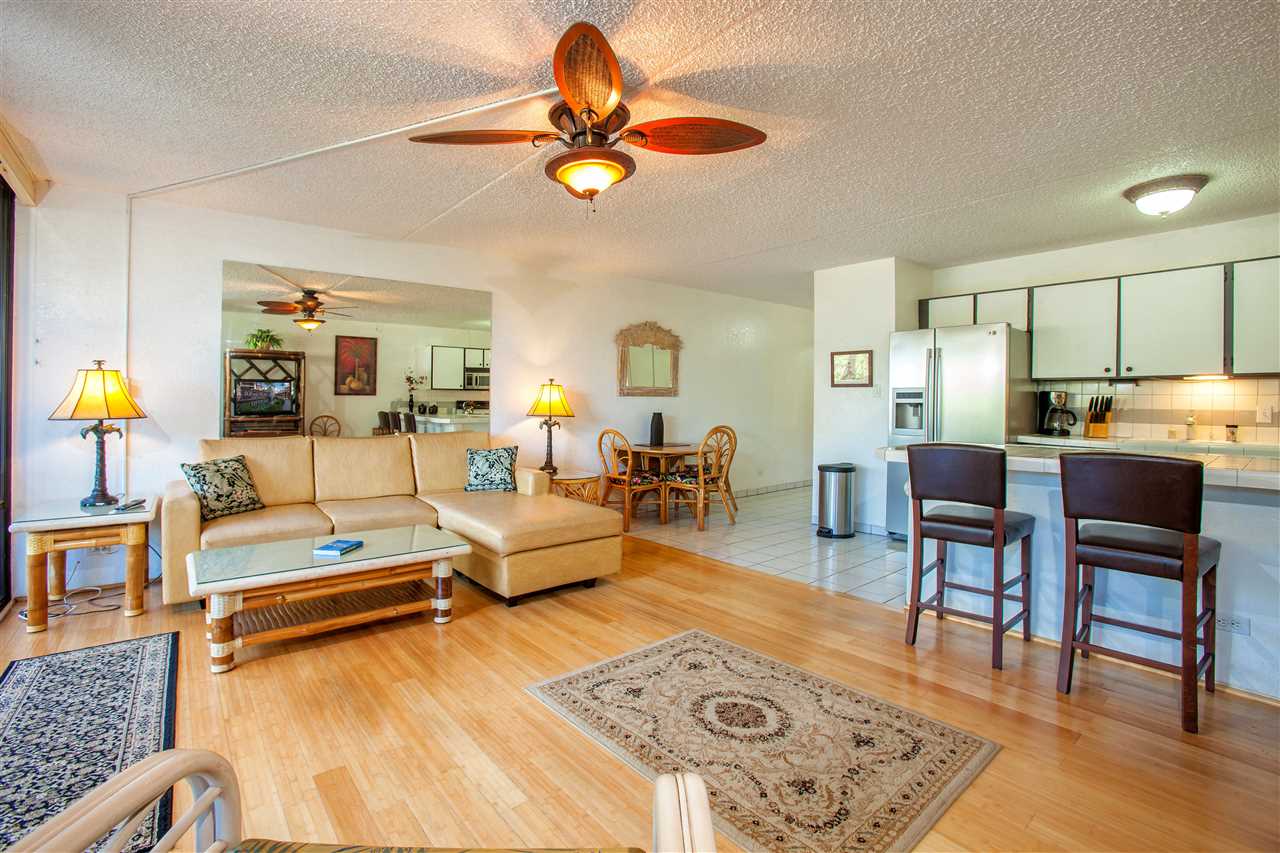 Spacious and convenient two bedroom two bath furnished vacation rentable condo. Condo amenities include pool, hot tub, tennis courts, and just a short stroll to popular Kamaole One Beach, restaurants and shopping. Easy to view!