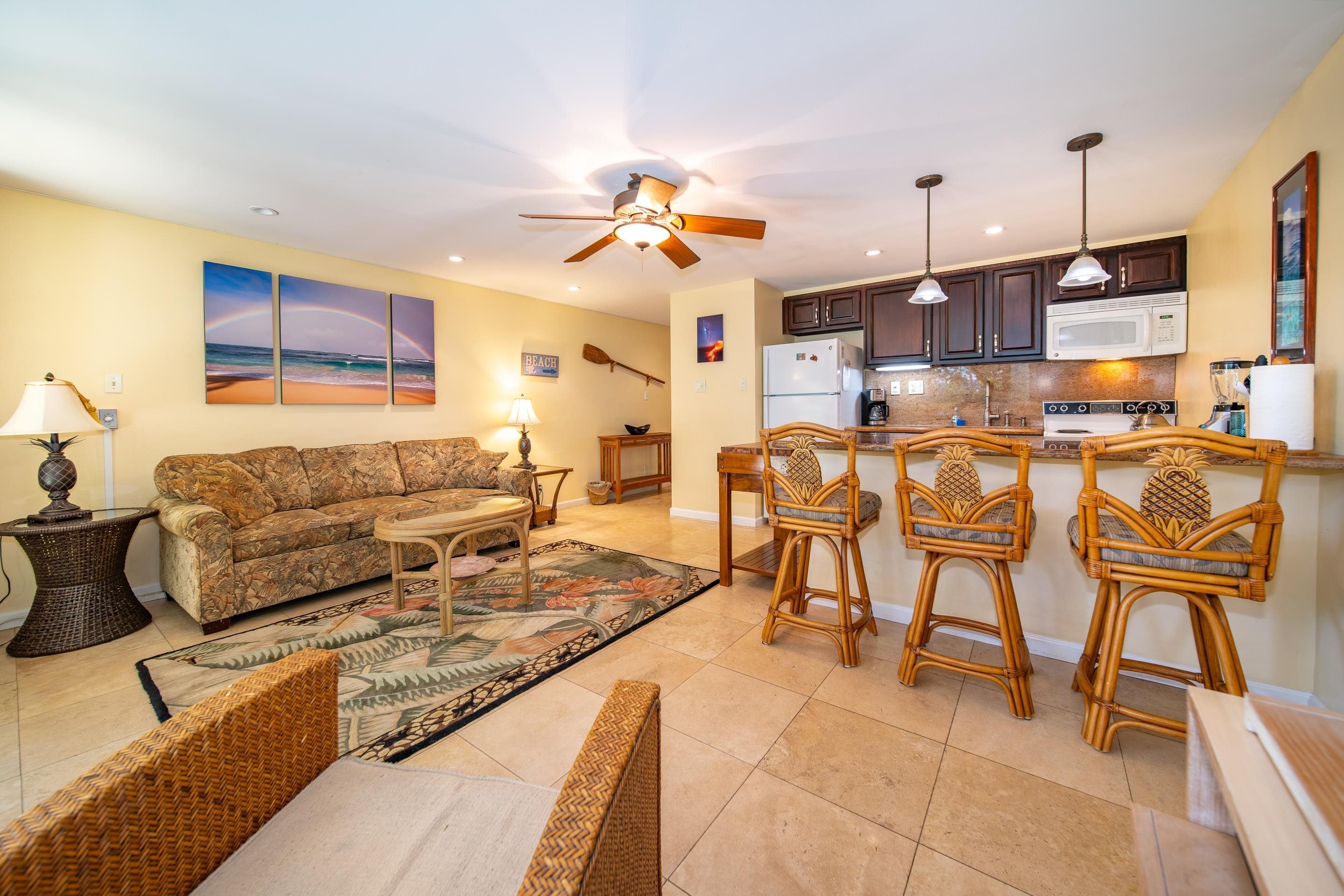 This lovely ground floor condo is located directly across from the pool yet offers a peaceful and quiet oasis. Upgrades include travertine tile, granite countertops, renovated bathroom, and interior washer/dryer. Tastefully furnished and ready to call home or rent short term. Kihei Kai Nani is well managed, located directly across the street from one of South Kihei’s most beautiful beaches, Kam II, and offers a large pool area, gas BBQ with picnic tables, and shuffleboard. Walk to shopping, dining and night life, a convenience and lifestyle that brings vacationers back year after year. Available to show October 6th and 7th, call for available times.