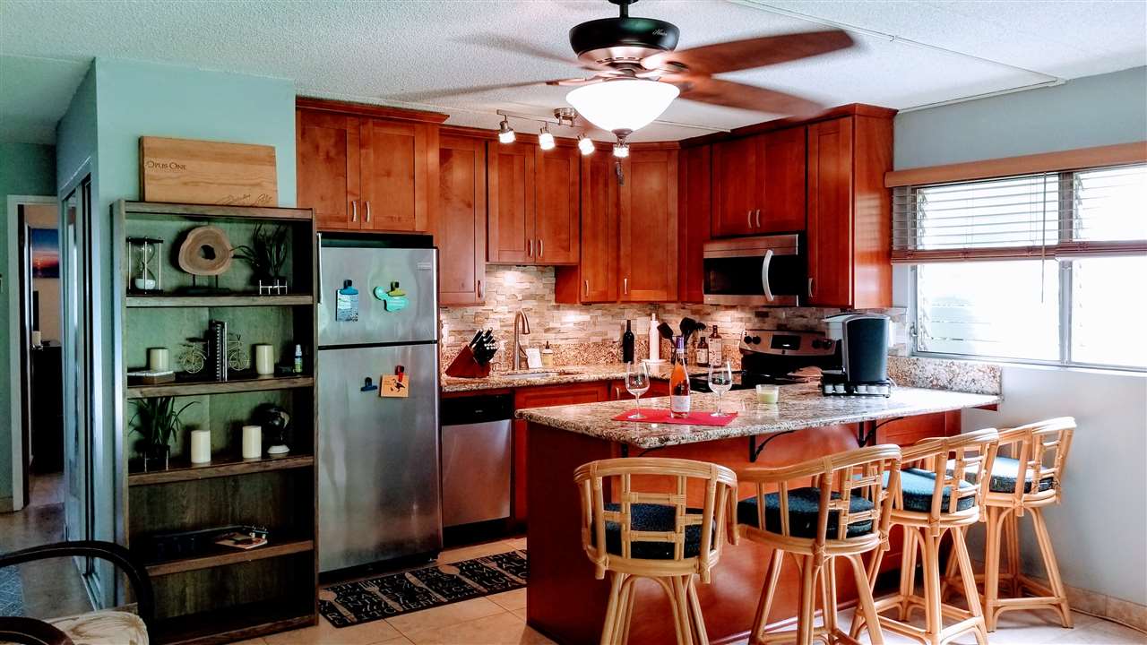 Best Priced South Kihei Beauty! Come see for yourself! Spectacular corner unit on the ground floor. Located in sought after Kihei Kai Nani, which sits next door to renown Moose McGillycuddy's & Fred's Mexican Restaurant. Right across the street is Kamaole II and is one of the many beaches that stretches along the 7 miles of South Kihei Rd. Current owner completed a full remodel on this one bedroom one bath condo including tile floors throughout. Double tree cabinetry, granite kitchen including island bar and tile shower from floor to ceiling. Two A/C's for hot summer nights or enjoy the wonderful tropical breeze. Open and spacious covered lanai which opens up to a lush green space offering BBQ grill and picnic table area. Within 100 steps to the beautiful pool, pool bathrooms, washers & dryers and extensive library for your enjoyment. Beautiful grounds and meticulously kept. Superb location to step out for evening strolls and nightly magnificent sunsets. Walking distance to many restaurants, bars & shops. Condo comes completely furnished and fully loaded with high quality items. From linens, towels, flatware, cookware, dishes, kitchen appliances, patio furniture, beach chairs, coolers, snorkel gear AND MORE. Just bring your suitcase. Very lucrative short term vacation property with seller grossing over $60K last year with almost 100% occupancy. Agent makes zero claims or guarantees to these monies. Or purchase for your primary residence and enjoy all the wonders of our beautiful island. HOA dues include water, sewer, garbage, AND Wi-Fi/cable! Call to make your appointment today!