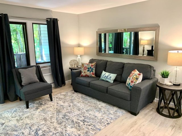 Welcome to Kihei Resort, a friendly well maintained condo complex with only 64 units. Complex includes secluded pool & spa area. Residence #112B is a newly remodeled ground-level corner unit, offering a spacious 1-bedroom, 1-bathroom apartment with updated amenities. The partially covered lanai offers a relaxing space to enjoy the garden view with a side gate so you can wash off the sand when you come in from the beach. Inside enjoy remodeled kitchen with white cabinets, designer touches, appliances and flooring. Hall closet includes full size washer and dyer. Main room and bedroom each have their own a/c unit. All current furniture and staging will stay. Situated across the street from Kalepolepo Beach Park and just a short distance from Sugar Beach, this location offers easy access to the ocean. Kihei Resort has a pet-friendly policy, welcoming cats and birds into the units. This condo comes with 1 assigned parking stall. Unit allows 2 cats or birds, dogs are not permitted. Price has recently been reduced as sellers have identified another property for a 1031 Exchange.