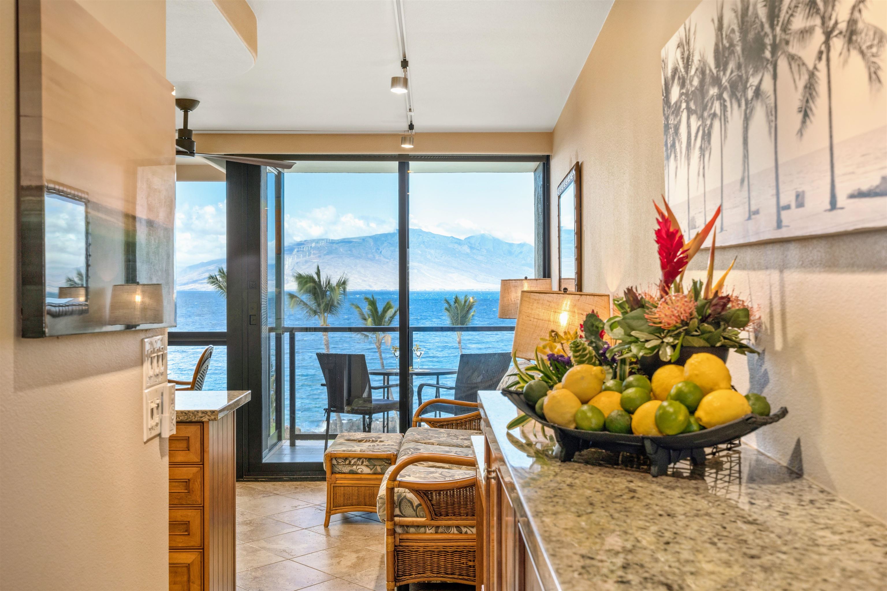 Location, location, location! South Kihei oceanfront, next to Wailea. Spectacular, full-on Ocean and Lanai island views from this turnkey oceanfront 5th floor condominium. This classy, well-appointed, fully furnished unit has a strong rental history. The remodeled unit features granite countertops, stainless steel appliances, tile floors – and views! The pool area has recently been updated, and Maui’s iconic Keawakapu Beach is adjacent. Wailea, with its stunning beaches, snorkeling, shopping, restaurants, and upmarket amenities, is just walking distance away. The maintenance fee includes utilities – electricity, cable, internet, and phone.