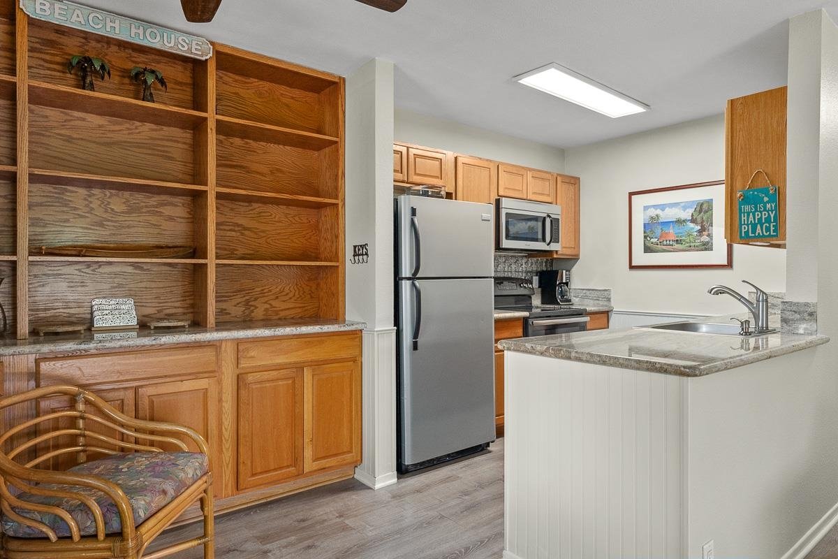 Furnished 2 bedroom, 1.5 bath with a fenced and extra large private lanai. Updated floors with LVP in the living, kitchen, dinning room, hallway and bathrooms. Granite countertops in the kitchen, New dishwasher, washing machine and dryer in 2024. One of the most desirable locations at Kihei Village on the beach side with beautiful views of Kenolio Park and a peek a boo of the ocean. Exit your front door, cross the park and the beach and the ocean is calling. Go for a swim, stroll miles of Sugar Beach or enjoy the sunsets, continue your stroll to the canoe club, Ululani's shaved ice, Sugar Beach Bakery and the Farmer's Market by the ABC store. There's a dog park across the street from the condo too. Celebrate Hawaiian culture and take in a jam session at Congressional Hawaiian Church. Conveniently located Just 15 minutes to Kahului, the airport, Costco, A short drive to Wailea's world class beaches and golf! call your favorite realtor for a showing today.