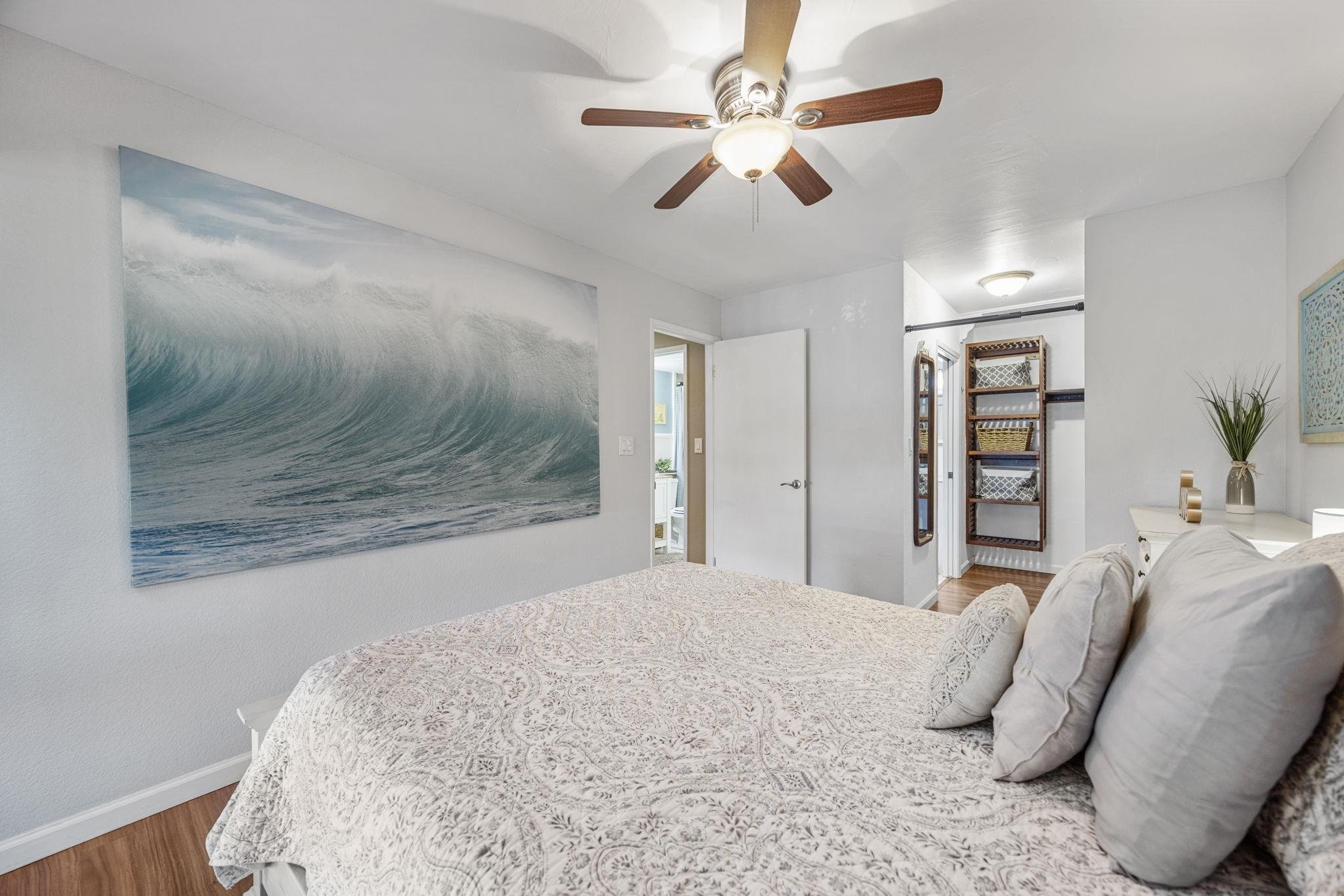 Former model ground floor 2 bed/1.5 bath condo at Kihei Villages! Discover this beautiful and tranquil home in the ideal location. The kitchen boasts a stylish tile floor, stunning floor-to-ceiling cabinets, recessed lighting, granite countertops, and stainless steel appliances. New wood laminate flooring flows throughout the unit, complemented by a lightly textured smooth ceiling and a ceiling fan in each room. The primary bedroom includes a dream walk-in closet, with a convenient pocket door between the primary bedroom closet and half bath, coupled with plenty of extra bathroom storage. The large private yard showcases a covered trellis lanai which compliments a wonderful outdoor living space. The yard is fully fenced, includes an outdoor shower, sprinkler system, and storage closet. Bonus items are the flower beds, sitting area and grass. This unit is conveniently located just a short distance from the beach and minutes from shopping. It includes two parking stalls! There is ample visitor parking both in front as well as on the side of building 9. This is an opportunity you won't want to miss!