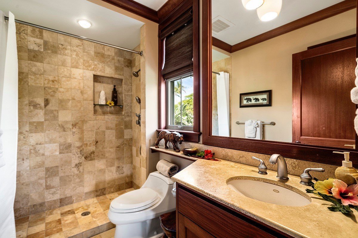Kolea Villa 1E is truly one of a kind- it stands out among the crowd! 1E was professionally decorated with a "Hawaiian Pacific Rim Fusion" theme. Special features include a pune'ee on the great room lanai, custom built furniture, canopied beds, stone flooring throughout, mural paintings, and special lighting. Spectacular sunsets and a view corridor to the Pacific Ocean complete this outstanding package.