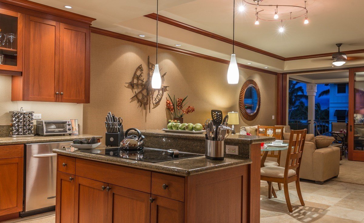 Beautiful appointed fully furnished (some sellers artwork/pieces not included) two-bedroom, two bath unit with partial ocean view from the lanai balcony. African Mahogany cabinetry, Travertine floors, Mahogany crown molding and baseboards, Granite counter tops, outdoor BBQ kitchen complete with sink and bar fridge. and stainless steel appliances. This second floor unit has easy elevator access as well as stairs, 1 car covered carport with separate secure owner storage. This is a non-smoking unit being offered. The private beach club with infinity edge pool, exercise hale, lava spa, sand bottom keiki pool and 2 guest hales for members and their guests is located within walking distance to Anaehoomalu Bay, a white sand beach. Kolea is also a short walk to the Kings' Shops and the Queens Marketplace with fine dining and shopping. Solidly booked vacation rental.