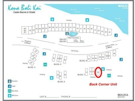 Kona Bali Kai is an oceanfront property, but made up of seven buildings. Buildings 1 & 2 (the lobby structure) are on the shoreline side of Alii Drive, while the other five buildings are just across the street on the mountain side. Building 1 holds 75 of the condos, the remaining 79 distributed in the remaining five residential structures.