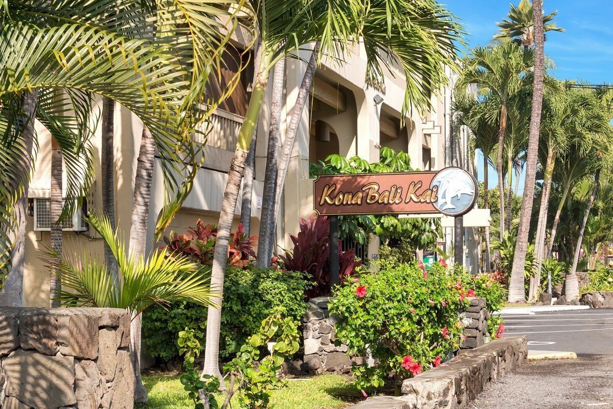 Kona Bali Kai is an oceanfront property, but made up of seven buildings. Buildings 1 & 2 (the lobby structure) are on the shoreline side of Alii Drive, while the other five buildings are just across the street on the mountain side. Building 1 holds 75 of the condos, the remaining 79 distributed in the remaining five residential structures.