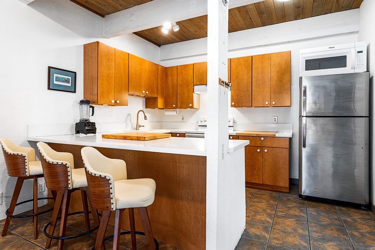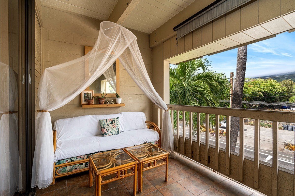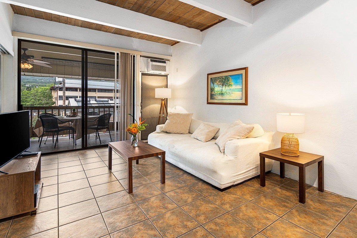Top floor, turnkey-furnished, 1-Br unit on makai side of Alii Drive! Open-beam ceiling, mountain-view, spacious lanai. Upgrades include: *AC (window unit) installed 2021 *Bedroom floor replaced 2018 *New, high-end (Maple) cabinets and quartz countertops installed in 2021 *New fridge and range installed 2020 *New dishwasher 2023 (to be installed prior to the close of escrow) * New kitchen sink installed 2021 The complex has an onsite rental agency and local poke eatery. The unit is situated steps away from the Banyans Surf Break- one of the BEST surfing spots on the island! The complex has a spacious and inviting lobby. On the oceanfront there's: a sandy beach area, BBQ's and picnic tables and you'll see year-round sunsets, too! The complex has an outdoor salt-water pool and spa! There's a trolley stop across the street to take you in to town for shopping, outdoor markets, outdoor volleyball, fine dining, tourist attractions, swimming, Boogie boarding and LOTS more! #330 does not have a Short Term Vacation Rental placard in place but Kona Bali Kai is STVR friendly. Sold as is. Live in year-round or rent out the choice is yours! Don't forget to click on the film icon at the top right to see a visual tour!