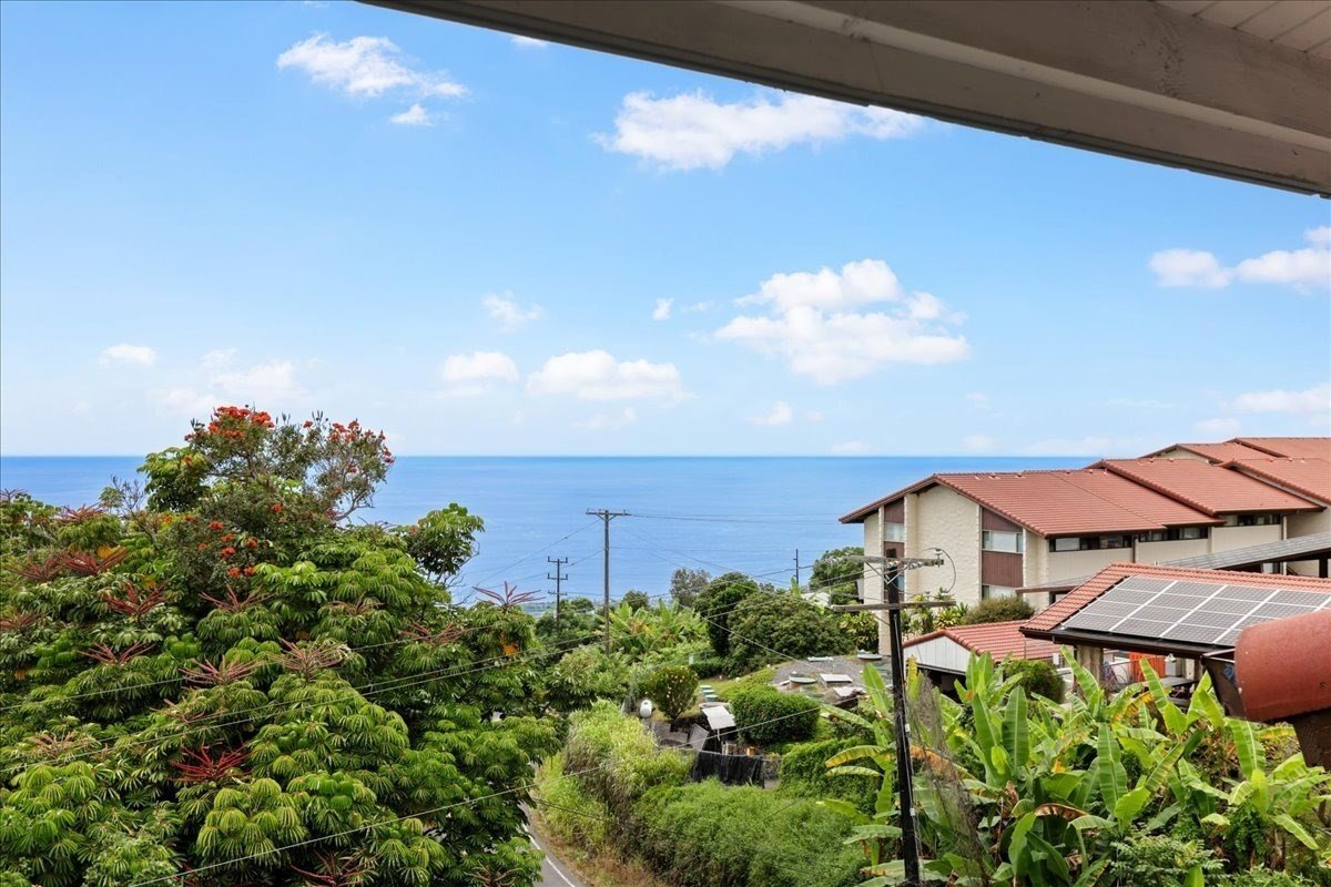 Welcome to this top floor unit with AMAZING OCEAN VIEWS located in the A Building. A-306 boasts vaulted ceilings in the main living area and both bedrooms which gives the unit a nice open feeling. The west facing wall in the living room is all windows which allows for views of the ocean and even a historic church steeple peeking out of tropical vegetation in the distance. The covered lanai is a great place to enjoy a relaxing morning or a beautiful sunset in the evening. New photovoltaic panels have recently been installed throughout the complex to benefit the community as a whole. Amenities offered at Kona Coffee Villas include a swimming pool, tennis & basketball courts and a bbq area. Monthly fees include water, sewer, trash removal, on-site manager, basic cable (internet not included), pest control, and common area maintenance. Short term vacation rentals (minimum of 7 days) are allowed with proper county certificate.