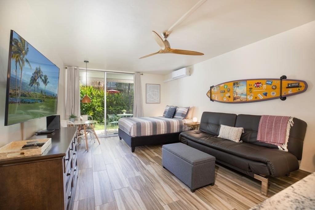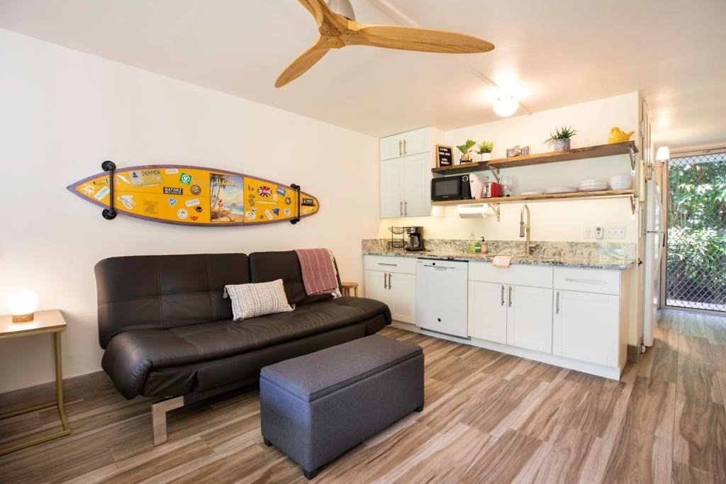 This is a leasehold property with the lease expiring in 2079. Welcome to the heart of Kona! This successful vacation rental is completely remodeled, this ground level condo offers easy access to the pool, spa, and BBQ area. It features a full-sized fridge, mini split ac, microwave, dishwasher, TV, queen bed, and convertible couch. The kitchenette is fully equipped, and all linens are included. With front desk staff and on-site laundry, convenience is guaranteed. Maintenance fees cover electricity, cable, internet, front desk staff, and exterior maintenance. This oceanfront property is steps away from the beach, restaurants, shops, and the trolley stop. Immerse yourself in the lush tropical landscape, admire the charming plantation architecture, and embrace the aloha spirit with sunset tiki torches.