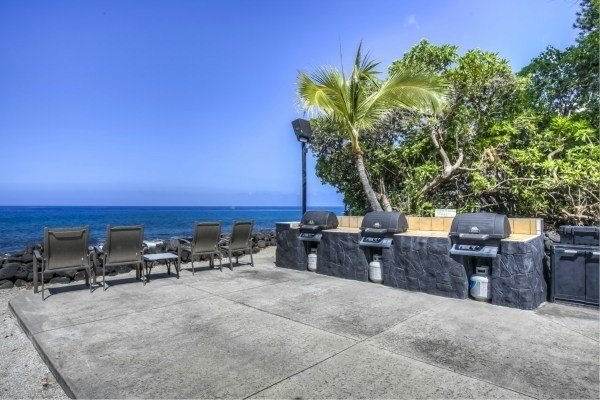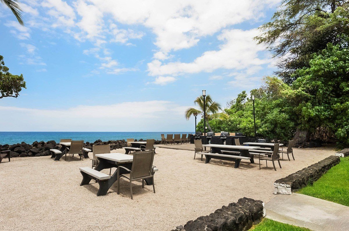 Popular Ocean front resort with private beach and BBQ area. This unit has been upgraded and features Oak cabinets and over sized tile lanai with 12 foot sliding glass doors. The bathroom features a large tile walk-in shower. Outstanding ocean views from your extended lanai. Beautifully maintained complex with affordable association fees seldom found in Kona. Exceptional tropical landscaping, heated ocean front pool, private beach area. Popular vacation rental. Fully furnished and ready to enjoy. *Interior pictures are delayed, due to vacation rental bookings*