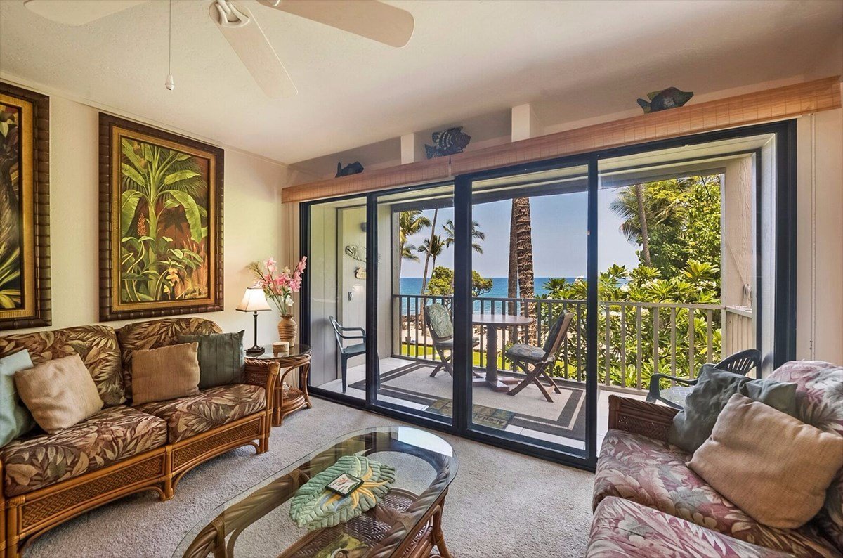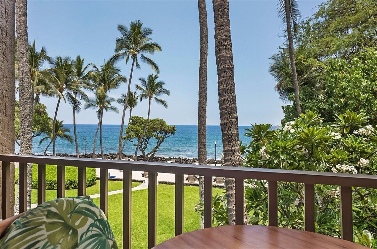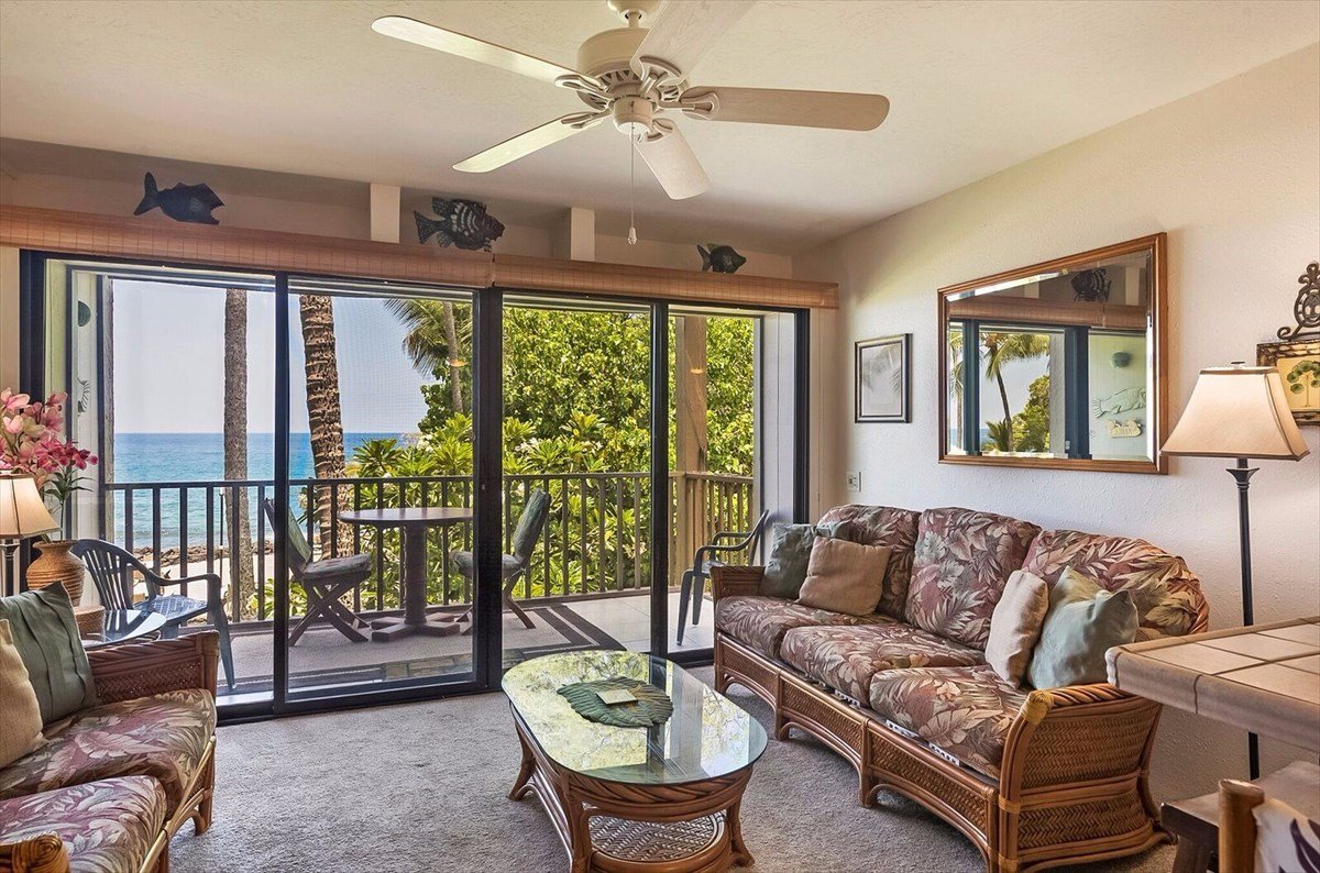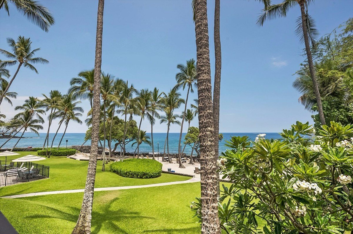 Stunning direct oceanfront views in this gorgeous one bedroom will make you never want to leave.The rhythmic sounds of crashing waves generated by the nearby Pacific Ocean provide a serene soundtrack to peaceful meals from the lanai, which overlooks immaculately maintained grounds. This second-floor end unit is located in one of the more peaceful parts of the quiet Kona Isle complex.