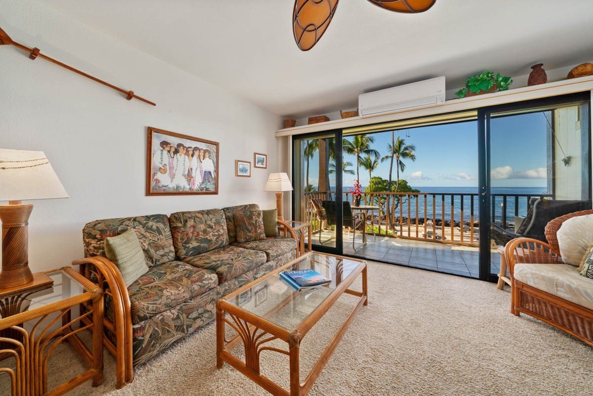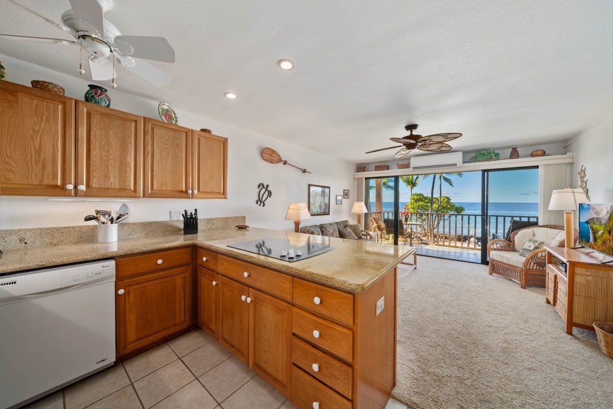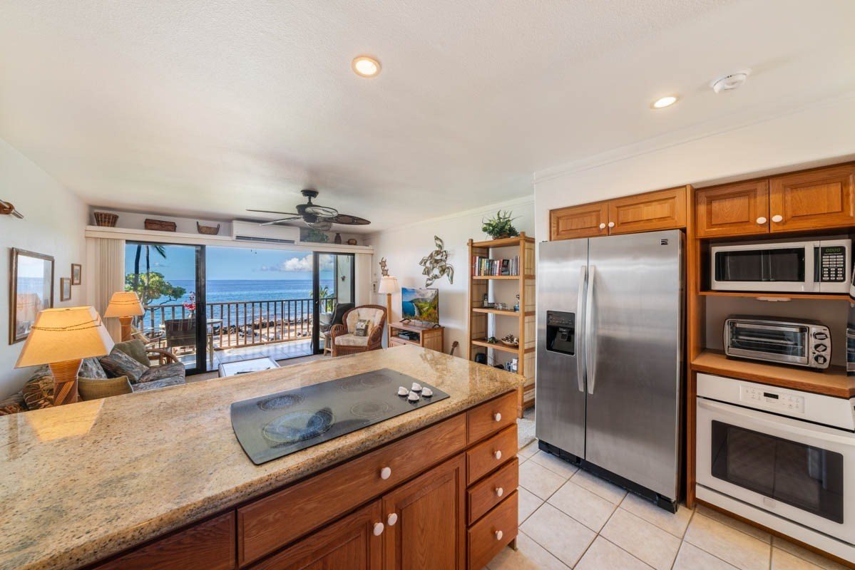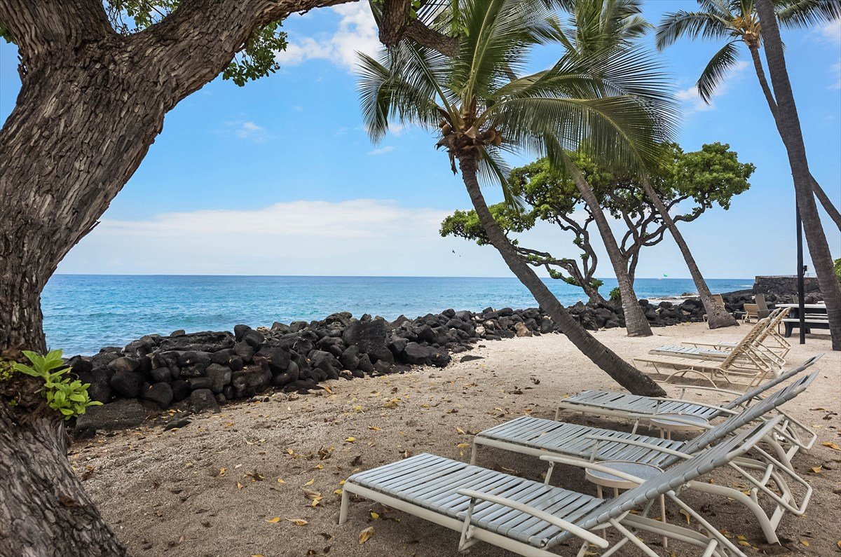 Fully updated oceanfront end unit with exceptional views and location in the complex. Ocean views from this entire unit, including the bedroom and bathroom. Solid granite kitchen counters, updated appliances including split zone AC for year-round comfort, convenient step-in glass block shower. Fully furnished successful vacation rental. Move-in ready. Kona Isle features some of the nicest landscaping and tropical ambiance on Alii Dr. Private beach area, oceanfront BBQ and picnic area, a heated oceanfront pool with restrooms and shower. Beautiful lush grassy lawns and an abundance of palm trees and gorgeous vegetation meticulously maintained. Truly, the tropical Hawaiian paradise you've been looking for. Future vacation rental to be honored by new owners. Sorry, no pets allowed. Non-smoking complex.