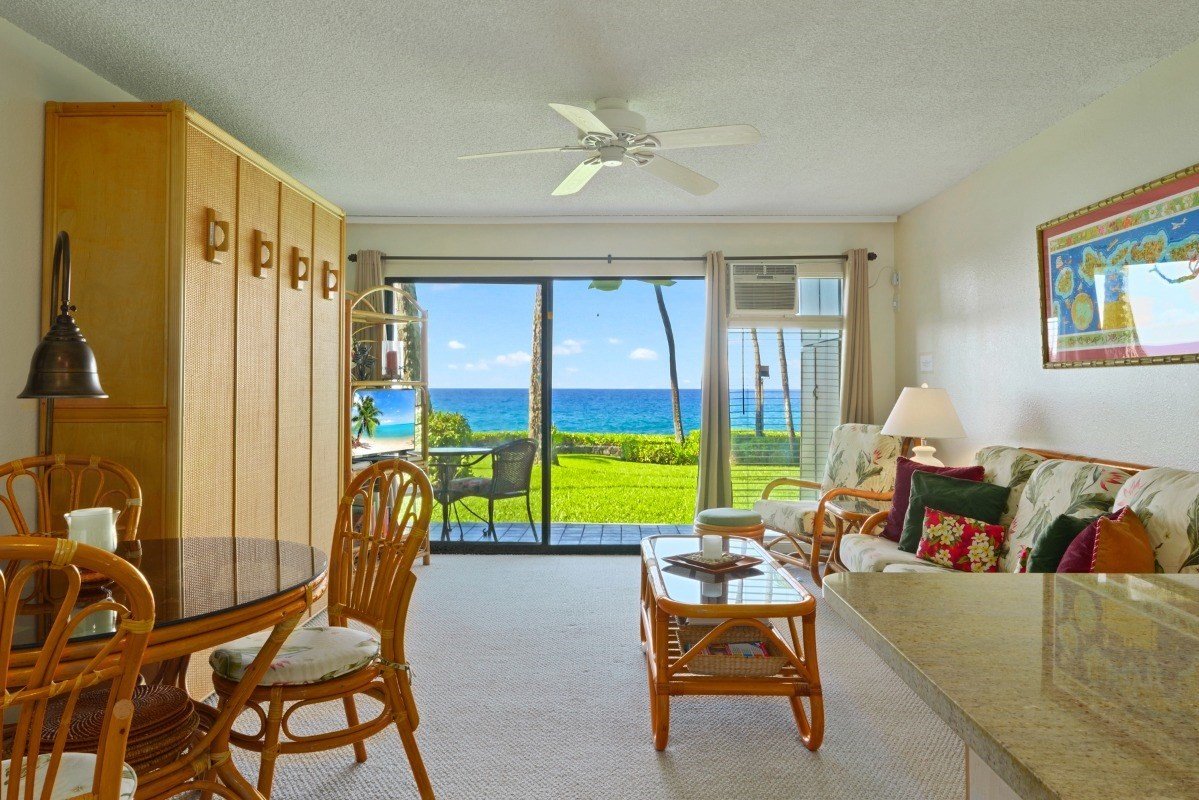 Beautifully update ground floor location no stairs. Step out your lanai door to the lovely grassy ocean front grounds of tropical Kona Isle condominiums. Enjoy the private sandy beach area just steps from this ideal location in the complex. Kona Isle offers you some of the finest tropical landscaping along historic Alii Dr. Take a dip in your ocean front heated pool, or just relax under the many swaying palm trees, while you watch the Dolphins and Whales play in your back yard. This popular vacation rental has everything a vacationer would need. Fold down Murphy bed in the living room for much better comfort than a pull out couch with ocean views and surf sounds to fall asleep to. Fully updated kitchen with gleaming granite counter tops. No expense has been spared updating the bathroom, as well as the entire unit. The bedroom is nicely furnished and this location has no parking lot noise for additional quiet and enjoyment. This is an ideal second home of vacation rental, just waiting for you to enjoy sunset cocktails on your tiled lanai. You'll love the ocean front BBQ area for wonderful evenings dining to your Hawaiian sunsets. Remember to look for the famous "green flash" at sunset!