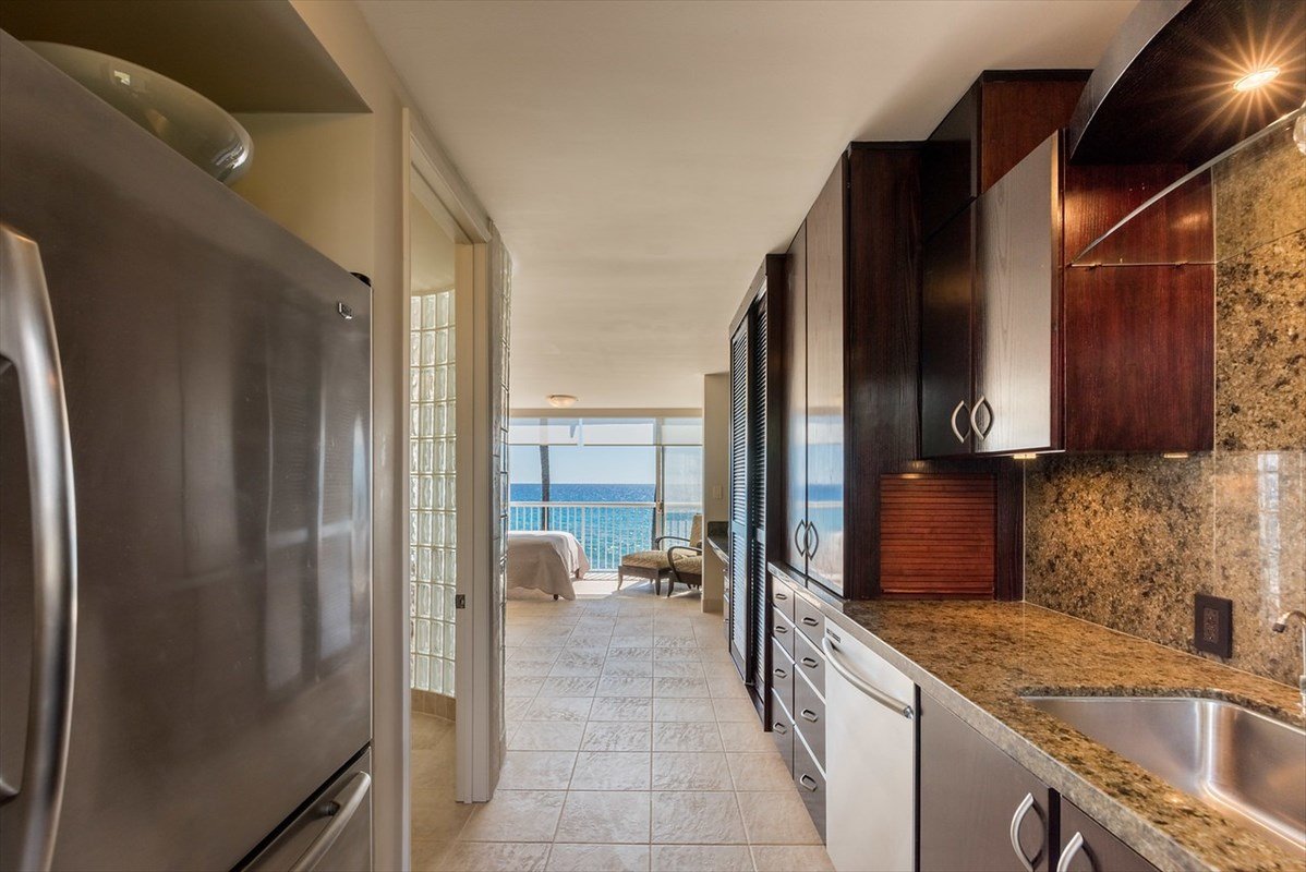 With everything done your heart could desire, the work is over...your search is over IF you want top-of-the-line interior & are happy to be lulled to sleep by the waves of the rhythmic ocean whenever you want to relax. This rare location at the favorite, fun Magic Sands Beach (on its south side) & has the new restaurant Magics Beach Restaurant opened & serving fabulous fare AND Pahoehoe Beach Park on the north side, too.. the SF is 480 SF, as the lanai was incorporated into the living space. African Mahogany, dense granite, oven-micro combo, quality lighting fixtures, W/D & DW w/2.5+- yr warranty left; porcelain tile throughout, custom build-ins for the most storage you can imagine; make this a fun condo to even be in for a preview much less, call your own or enjoy intimate entertaining in. AC mini-split, upgraded plumbing system, custom paint, appliance garage, office niche...everything has been thought of for your ultimate ocean-side living with even restaurant take out within a few steps...try the shrimp ravioli!