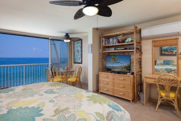 Spectacular top floor oceanfront studio! The moment you walk through the front door you will see beautiful blue waters, feel balmy breezes and enjoy the sounds of the ocean from this fully turnkey unit. Currently used as a vacation rental this refurbished condominium is ready to go. Want an island get-a-way? This unit offers the perfect location between two beach parks and a short distance from the Keauhou Shopping Center. Unit also features air conditioning for comfort and an on-site laundry facility. Unit sold with existing bookings.