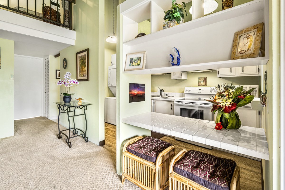 This is a leasehold property. Enjoy the views from this beautiful top-floor unit at Kona Makai. This successful vacation rental (STVR certified) is located on the third floor and comes turn-key for you and your guest’s comfort. Keep it as a vacation rental or make it your move-in ready home with all the required essentials.Step inside to the main living area with a primary bedroom, bath, kitchen equipped a with stacked W/D, dine-in nook and living room. As for room accommodations, the primary bedroom is adorned with a high vaulted ceiling, spacious king-size bed, and in-unit A/C. Atop the modern, spiral staircase is the furnished loft perfect for your guests to reside in the two available twin-size beds. In the stocked kitchen, you’ll find all the culinary essentials and appliances needed to prepare meals.Sit on the patio to enjoy the fresh air, enjoy the views of the pool and ocean particularly to take in an amazing Kona sunset. Because of the unit’s location, it does not peer into another dwelling rather it offers the views of the open area and the beautifully manicured tropical gardens below. From the loft to the lanai, you can leisurely sip your morning cup of Kona coffee, take in the ocean breezes spilling in through the sliding doors, and plan out an exciting day in paradise.Kona Makai is an oceanfront gated complex just off of Alii Drive near Kailua Bay with nearby dining and attractions in the heart of Kailua-Kona. Complex features offer a heated oceanfront pool and spa, BBQs with seating areas, work out room, two tennis courts, game area, covered parking and PV Solar.Maintenance Fees include Water, Landscaping, Resident Manager, Trash, Pool Service, Cable TV, and Internet.Prospective Buyers are urged to conduct their own due diligence before committing to the purchase of this property. This property is not equipped with elevators.