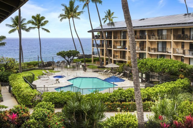 The Kona Makai is an oceanfront community, the nearest condos located at the very edge of the coastline, only 20 yards from the Pacific. The complex is gated, but only at night to add further security and privacy during those hours.