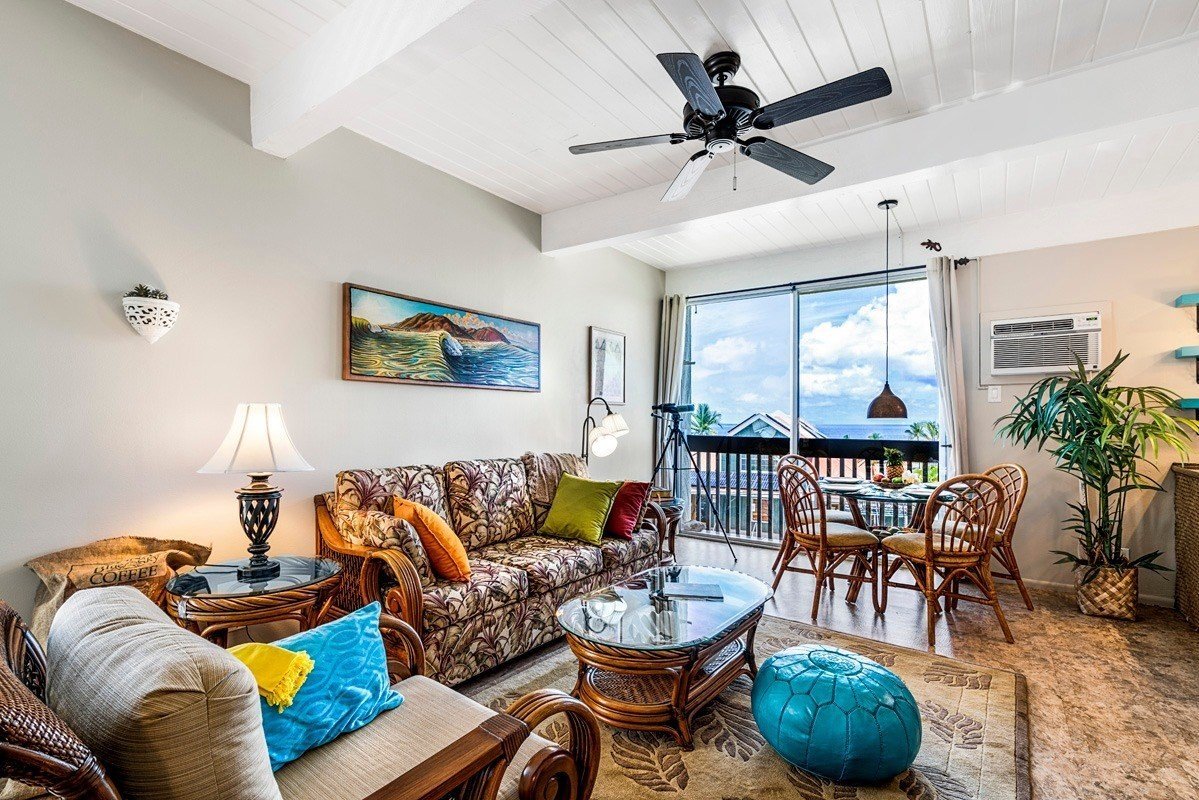 - Corner unit with an incredible expansive ocean and famous Kona sunset views - Whale watching during the winter season from the lanai - Completely renovated, move-in ready condition - Turnkey furnished with Hawaiiana decor - Short Term Vacation Rental (STVR) with rental history. STVR # 19-353529 - Dog-Friendly complex with Board approval. - Pool and BBQ recreation area - On-site manager