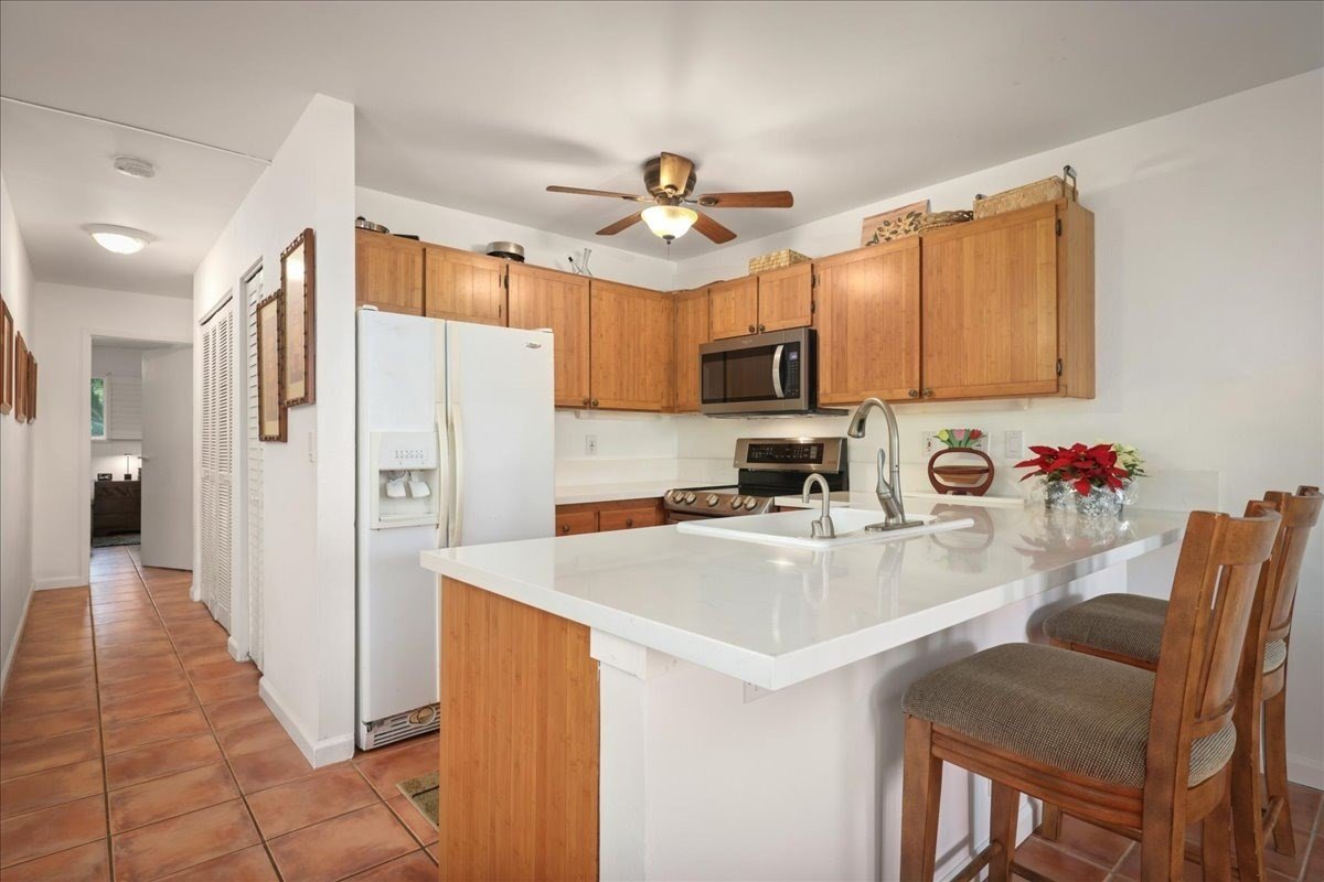 Stunning Ocean Views from this 2 bedroom 2 bath Kona Palms end unit. Kona Palms is a small 12 unit complex located on Alii Drive at Lymans Bay which is a well known Kona surf spot. This end unit offers a large wrap around lanai with privacy in a concrete building with 2 dedicated parking spaces in the covered parking garage plus elevators. Tile floors throughout with bamboo cabinets, quartz countertops in the Kitchen and split AC units in each room. Conveniently located near the pool and cabana this is an ideal location for a second home or vacation rental. Great location on Alii Drive close to beaches, steps from surfing, restaurants, shops and minutes from downtown Kailua Kona and Keauhou. Currently owner occupied but property is zoned for short term rentals.