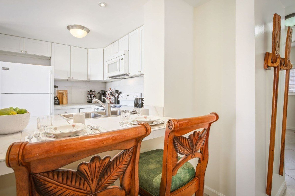 * Spacious Covered Lanai with Cool Ocean Breezes. Tiled Flooring throughout. * Remodeled with furnishings and appliances purchased within the last 4 years. * New Zone A/C installed in Bedroom and Living area during August 2023. * New Cabinets in Kitchen and Bath. Tiled Shower, Tile Inlay, Modern Vanity. * Bar-seating in the Kitchen area ensures Dining Options both inside and out. * Existing Vacation rental reservations which the new buyer could assume.