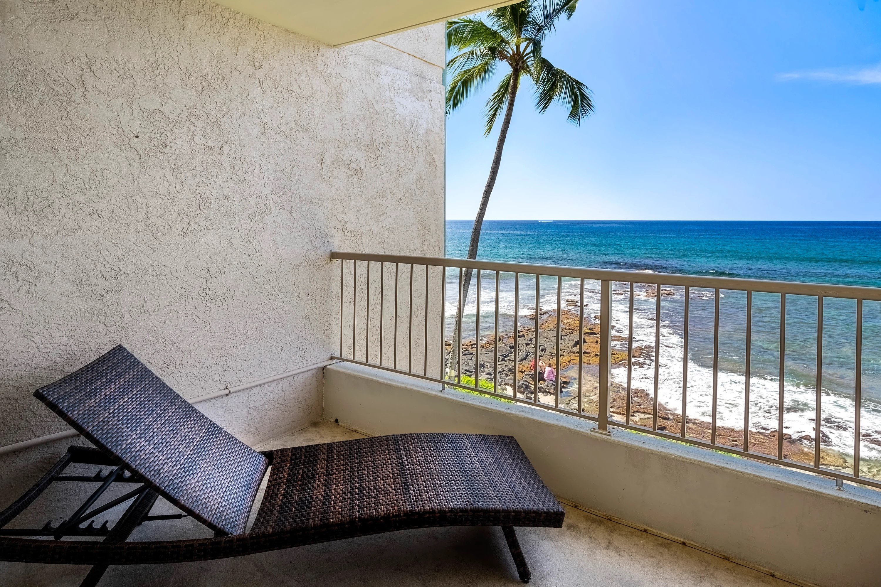 Rarely Available !!! Fee Simple 2-Bedroom, 2-Bath Direct Oceanfront Corner Unit with Unobstructed Panoramic Ocean Views. Originally A-27 was one of the Developer's personal units, overlooking the ocean and beach to the west, pool area and Kona downtown to the north. This upgraded unit features ocean views through-out the condo, tile floors, granite counter tops, 2 large closets in the main bedroom, one locking closet for owners, and a custom walk-in shower. End-unit location offers additional windows down the side! Spectacular oceanfront views, amazing year-round sunsets. Watch the dolphins, whales when in season, surfing right out in front, fishing boats/cruise ships/canoes passing by, and very popular sandy Honl's Beach Park just steps away. This condo is being sold turnkey-furnished in tropical decor with quality furnishings throughout.