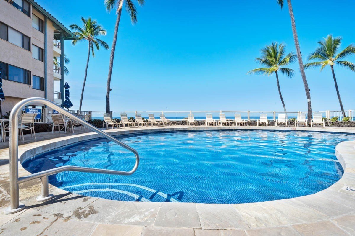 Well appointed Kona Reef end unit with ocean views. All tile floors for easy care living, fresh paint and nicely furnished. Convenient updated step-in shower with end unit extra windows. Granite counter tops in the kitchen, breakfast bar, Oak cabinets, and newer appliances, and a full size stacking washer/Dryer. The bedroom offers a King bed and wall mounted flat screen TV.Kona Reef offers an ocean front pool and hot tub, covered outdoor BBQ pavilion and a lovely sandy beach right next door for surfing and swimming. You'll enjoy covered parking, elevators, and just a short walk to historic Kona downtown shopping and restaurants.This condo shows very nice, and has has always been well maintained.This is a successful vacation rental location.
