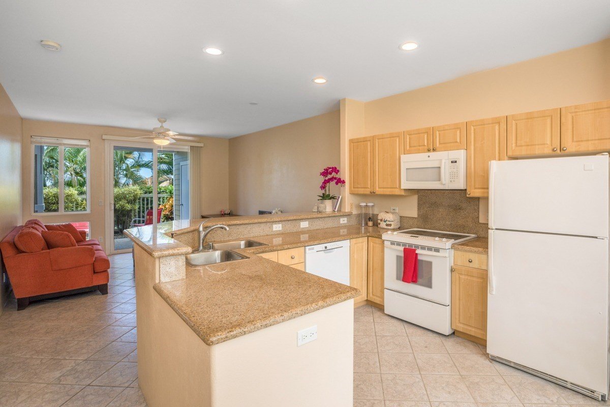 Embrace tropical living from this ground floor condo with a tiled lanai and room to garden. Share an evening with friends on the lanai and watch the stars emerge.Just inside, the great room is marked by abundant natural light, window AC, and all tile floors. The kitchen is generously sized with lots of counter space for preparing your favorite island fare. There are plenty of cabinets for storage, a slide-in, glass top range and a bar. The granite countertops complement the cabinets beautifully. Large windows highlight the dining nook.The spacious master suite features dual closets and large windows that invite the ocean breeze (AC if you need it). Wake up to sunshine and rustling coconut palms and start planning the day's activities. The master bathroom includes a walk-in tile shower, a beautiful vanity with two sinks and a separate water closet.The guest bedroom faces the mountain and enjoys the cool air that drifts down from Hualalai in the evening. A nearby guest bathroom is beautifully appointed like the master and it includes a bathtub with shower shower fixtures.Kona Sea Ridge is a gated condo community marked by expansive lawns, beautiful tropical foliage and palm trees. This oasis is set right along Alii Drive a short distance of restaurants and shops in downtown Kona. A stunning, lagoon style pool, hot tub, gas barbecues and workout room create the resort lifestyle you’re seeking. And it’s a private resort; short-term rentals less than 30 days are not allowed.Challenging golf courses, incredible dive sites and thrilling surf breaks all lie nearby. Or spend a quiet afternoon beside the pool with a great book.Home inspection - Termite Report - Disclosure - Inventory - Title Report are all available upon request. Two parking spaces - Maint. Fee $417.69 - One indoor cat or bird with board approval - no dogs. Seller is being transferred back to California and hates to go!
