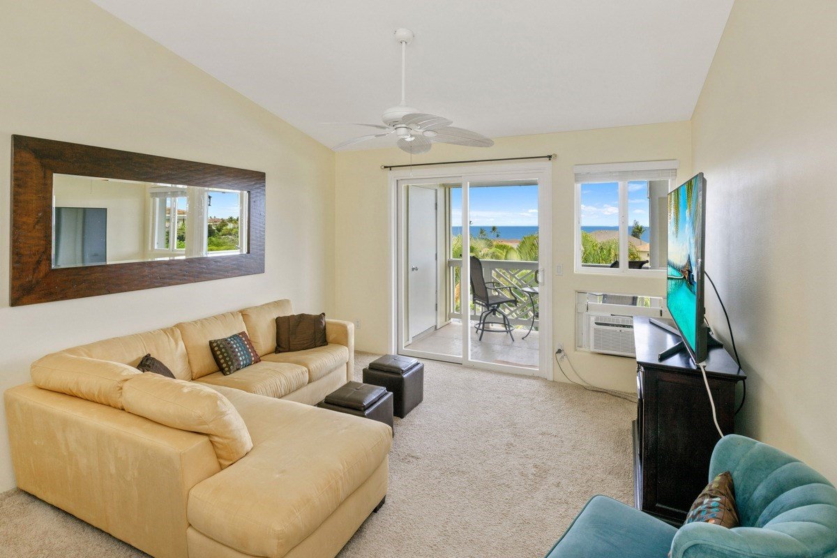 Brilliant sunshine and vaulted ceilings create a sense of space in the great room. The kitchen features granite countertops and a long dining bar. Gather around the kitchen until dinner is ready. Then, share a meal on the tile lanai and watch the golden sun sink into the ocean once again.