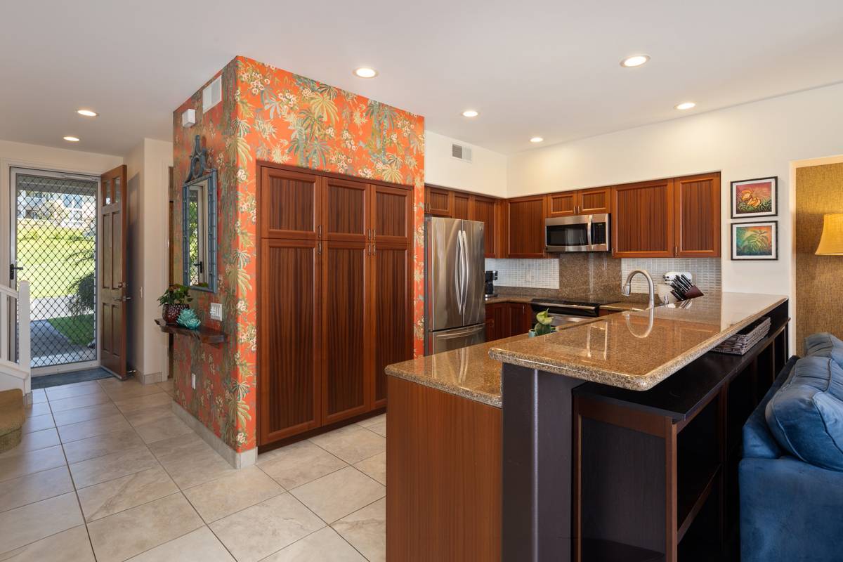 Are you looking for a very special space to become your primary home in Hawaii or a beloved second home? Welcome to Kona Sea Villas G1, an absolute gem. Beautifully upgraded and lovingly maintained by its owners as their primary home, this is a special space, located just minutes from the sun kissed Kona coast. The “Wow factor” includes year round sunsets, ocean and mountain views, 1763 sq feet of centrally air-conditioned living space, 3 bedrooms, 3 baths, bonus den area, ground floor bdrm/bath, rich woods, cooling tile, lovely art, quality furniture, a garage + deeded space, 2 lanais, tropical foliage, a fruit and herb garden, all peacefully and privately located with the sounds of birdsong everywhere…. Just take it in and let the magic wash over you ~ Numerous upgrades only partially listed here: Exterior: Motorized SunSetter awning Solar tiki torches Custom gate access to a lovely herb garden Shaded orchid bench with potted & palm tree-mounted orchids Automatic irrigation for potted plants and flower beds Lime, lemon & kumquat trees Weber Spirit II E 210 gas barbecue w/cover Custom shelving in the lanai storage closet Interior: SunTek DRDS 25 solar film on all windows Energy Efficient - Trane AC and LED lighting throughout. Upgraded paint - Sherwin Williams “Paperwhite” on walls & “Westhighland White” on trim Sold Turnkey Upgraded ceramic tile floors Grass cloth wallpaper & tropical print wallpaper accents Custom-Made Plantation Shutters and Smith & Noble ivory pinch-pleated drapes, curtain rods and honeycomb shades Woven wood shades Mahogany cabinets by Wick Rice Cabinetry in the kitchen and bathrooms Large customized pantry features pullout shelving and hidden garbage/recycling nook Upgraded stainless steel appliances and washer dryer Updated tile shower, bathroom flooring, vanity tops and sinks