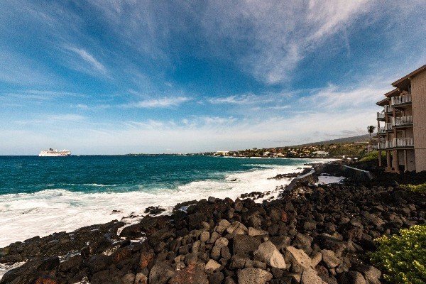 The Kona Shores is an almost-oceanfront property, one neighboring property between it and the shoreline. Shores condos nearest to the Pacific are only about 100 yards from the swells. The unusual shape of its lot includes a ‘handle’ that extends to the ocean and holds the complex’s recreation area, including a pool and sundeck rig... Read more