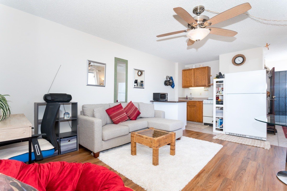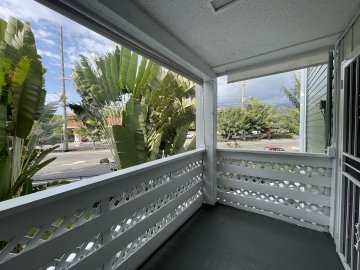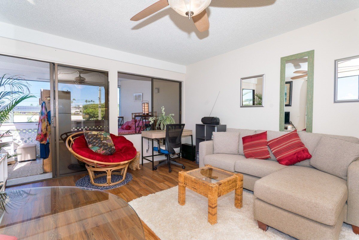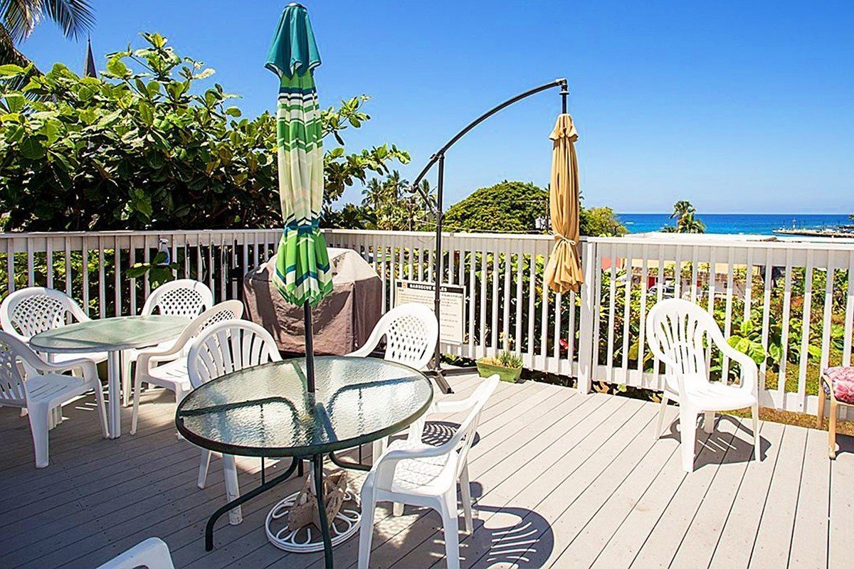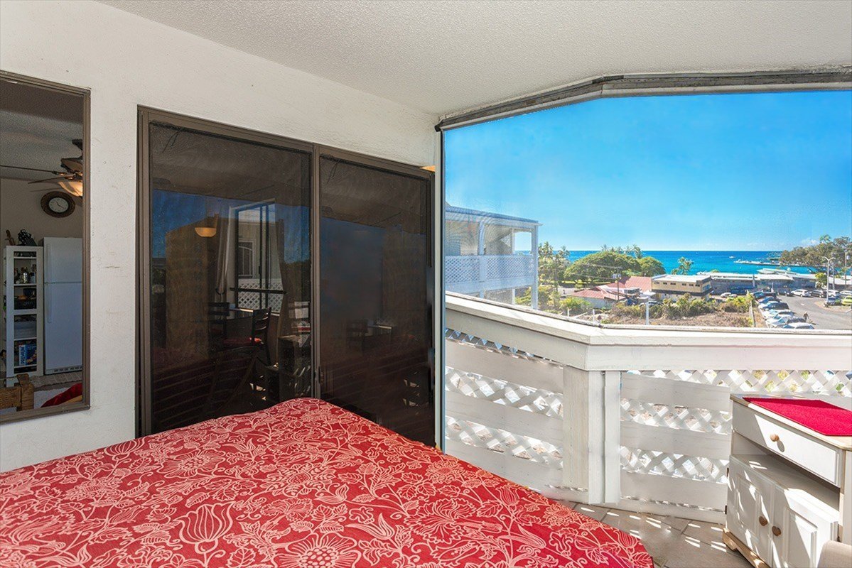 Best unit at Kona West with exceptional unobstructed ocean and Kailua Bay/Pier views! Very private top floor, corner studio located literally in the heart of downtown Kailua Kona. Unit is very comfortable and livable for two people as a permanent residence or investment property great for a vacation rental. Property offered turnkey furnished and comes well equipped with shower/tub, kitchenette, microwave, four top electric range/oven, full refrigerator and security front door. The absolute highlight is the semi enclosed screened in 180 ft. lanai with beautiful ocean views! Additional features include new vinyl wood plank flooring, freshly painted interior, air conditioner and convenient location close to pool. Amenities of Kona West include a large above ground pool and spa overlooking Kailua Bay with BBQ's to enjoy, shared laundry, one covered or uncovered parking stall per unit, and on site resident manager.