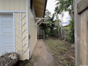 Meticulously remodeled, spacious multi-family gated compound w/ lava rock wall, fruit trees, Koi Pond, PV, and is located just steps from a secluded sandy beach, bike path and minutes from Haleiwa town. This duplex configuration is ideal w/ a 3 Bed/2 Bath on one side w/ a 2 Bed/1 Bath w/ dedicated fenced yard & laundry room on the other + large bonus room w/ separate entrance & full bath upstairs. In the primary unit, the well-designed split floor plan features an impressive primary bedroom with luxury bathroom. Dual sinks to crown molding, & a spacious walk-in shower w/ floor to ceiling Carrera Marble - you'll feel like you're living a resort life. The chef’s kitchen boasts SS appliances, convection gas oven, shaker cabinets, stone countertops, spice drawer, in-cabinet electricity & sizable pantry. Down the stairs to the left are 2 more bedrooms & another Carrera-marble bathroom. Craftsman details throughought w/ accent walls, wainscotting, crown molding grounded w/ low maintenance Luxury Vinyl Plank flooring (LVP). The backyard oasis w/ soothing waterfall Koi pond & covered lanai is perfect for relaxing after the beach or a day out.