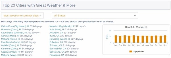 다음은 여름철 일일 최고 기온 70~90도 사이 / 연간 강수량 35인치 미만인 미국 상위 20개 도시의 목록입니다. 이 중 13개의 도시가 하와이에 위치합니다: