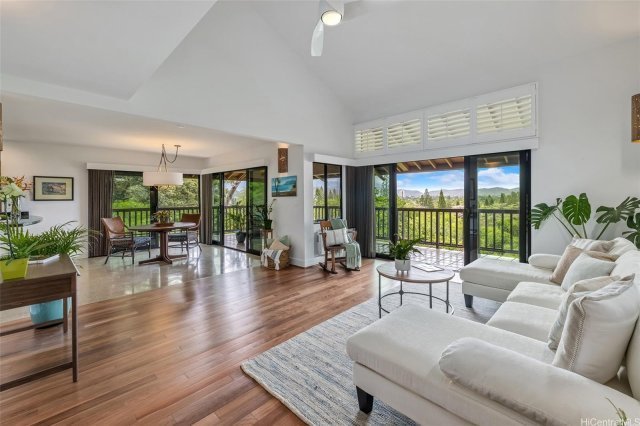 Stunning mountain and golf course views greet you from this unique corner end unit with wraparound lanai on the Kailua side of Bluestone. An expansive distance to the facing neighbors makes for utter privacy. Unlike most units on this side of the complex, this rare floor plan does not have you enter through the primary bedroom closet from the garage! Simply walk from the garage to an entry landing, and down a few steps to the living area, or up a few steps to the bedrooms – perfect! This superbly appointed townhome offers an upgraded kitchen with custom koa cabinets, granite counters and stainless steel appliances including a newer refrigerator. Beautiful porcelain tile and newly laid brush box flooring graces the lower level, with Brazilian cherry hardwood flooring upstairs. Enjoy the serenity of the Ko'olau Mountain range and golf course views. This townhome is conveniently accessed from the Enchanted Lake side, with a secure, gated entry. A walking path leads to resort-like amenities including tennis courts and a beautiful pool and spa. Close to the Enchanted Lake Shopping Center and Kailua town, with its boutiques, restaurants and farmers markets, and world-famous Kailua Beach.